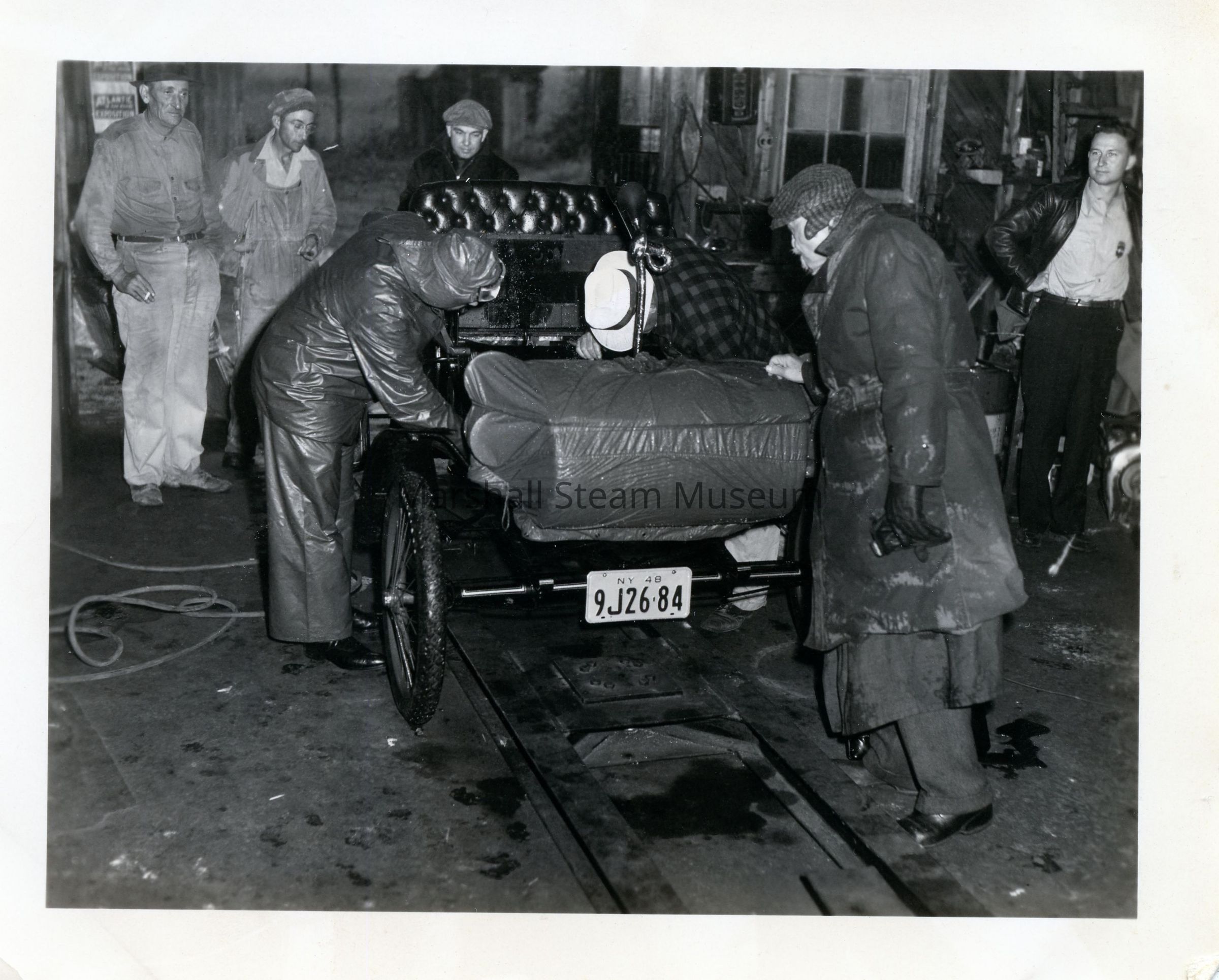 Bud Gilbert preparing to leave Williamsburg with Major Augustus Post on right. Major Post participated in the original Glidden Tour of 1904. He is 80 years old at the time of this picture and passed away at 84.Photograph Details