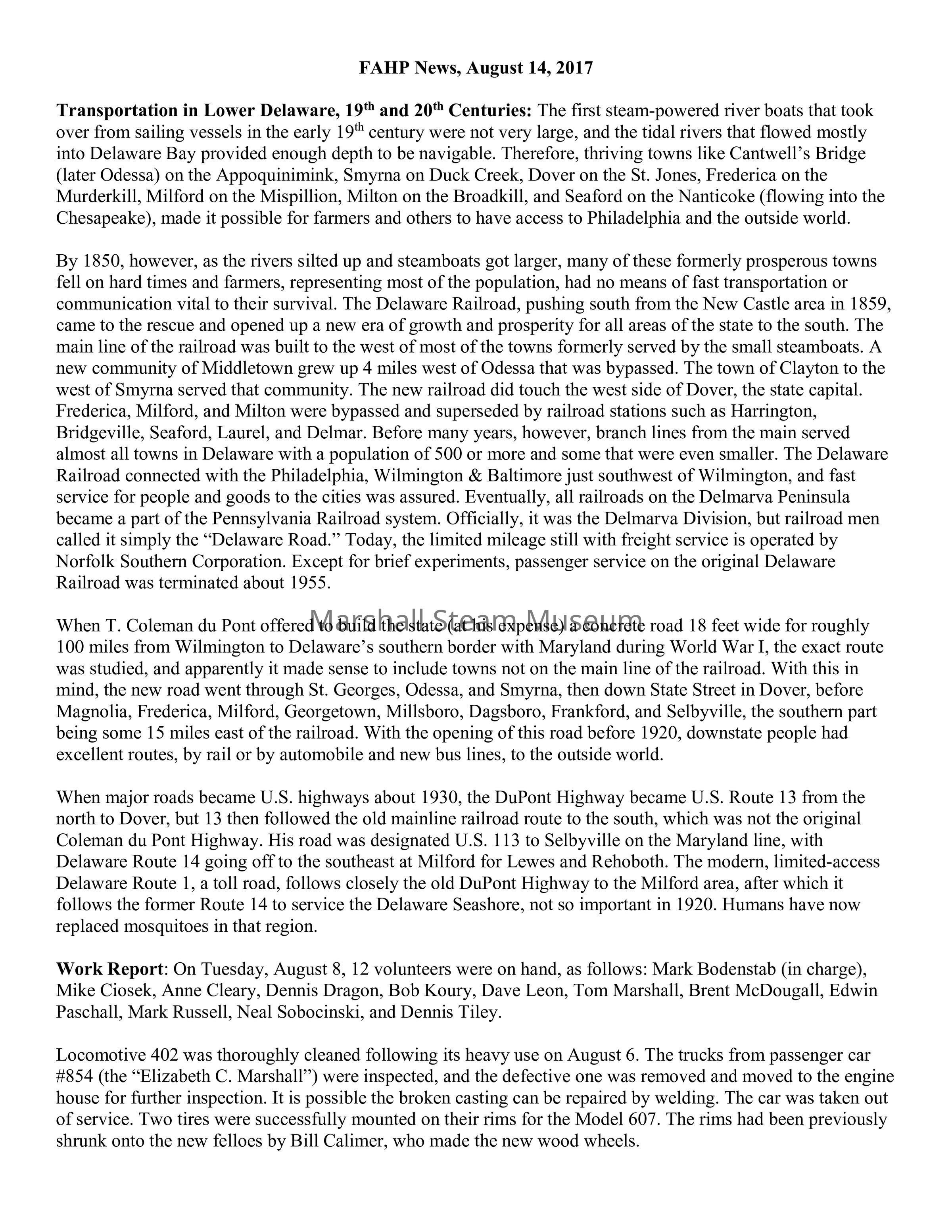 Transportation in Lower Delaware, 19th and 20th Centuries: The first steam-powered river boats that took over from sailing vessels in the early 19th century were not very large, and the tidal rivers that flowed mostly into Delaware Bay provided enough depth to be navigable. Therefore, thriving towns like Cantwell’s Bridge (later Odessa) on the Appoquinimink, Smyrna on Duck Creek, Dover on the St. Jones, Frederica on the Murderkill, Milford on the Mispillion, Milton on the Broadkill, and Seaford on the Nanticoke (flowing into the Chesapeake), made it possible for farmers and others to have access to Philadelphia and the outside world.