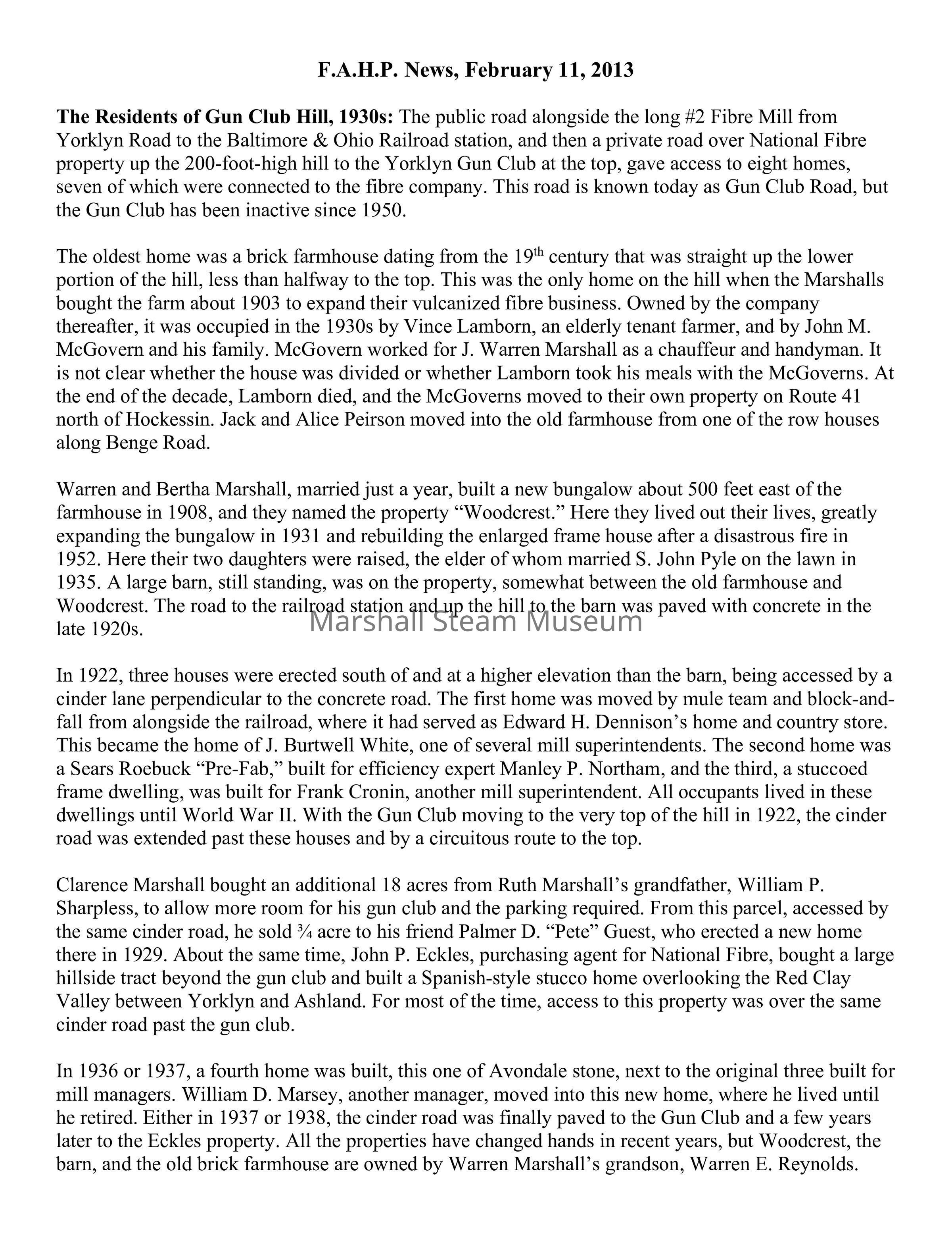 The Residents of Gun Club Hill, 1930s: The public road alongside the long #2 Fibre Mill from Yorklyn Road to the Baltimore & Ohio Railroad station, and then a private road over National Fibre property up the 200-foot-high hill to the Yorklyn Gun Club at the top, gave access to eight homes, seven of which were connected to the fibre company. This road is known today as Gun Club Road, but the Gun Club has been inactive since 1950.