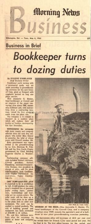 Clipping of the May 4, 1965, Wilmington (DE) Morning News report on Jeanette Henter operating the dozer at the groundbreaking of the new Crowell Tape plant in Newport, DE.General Notes