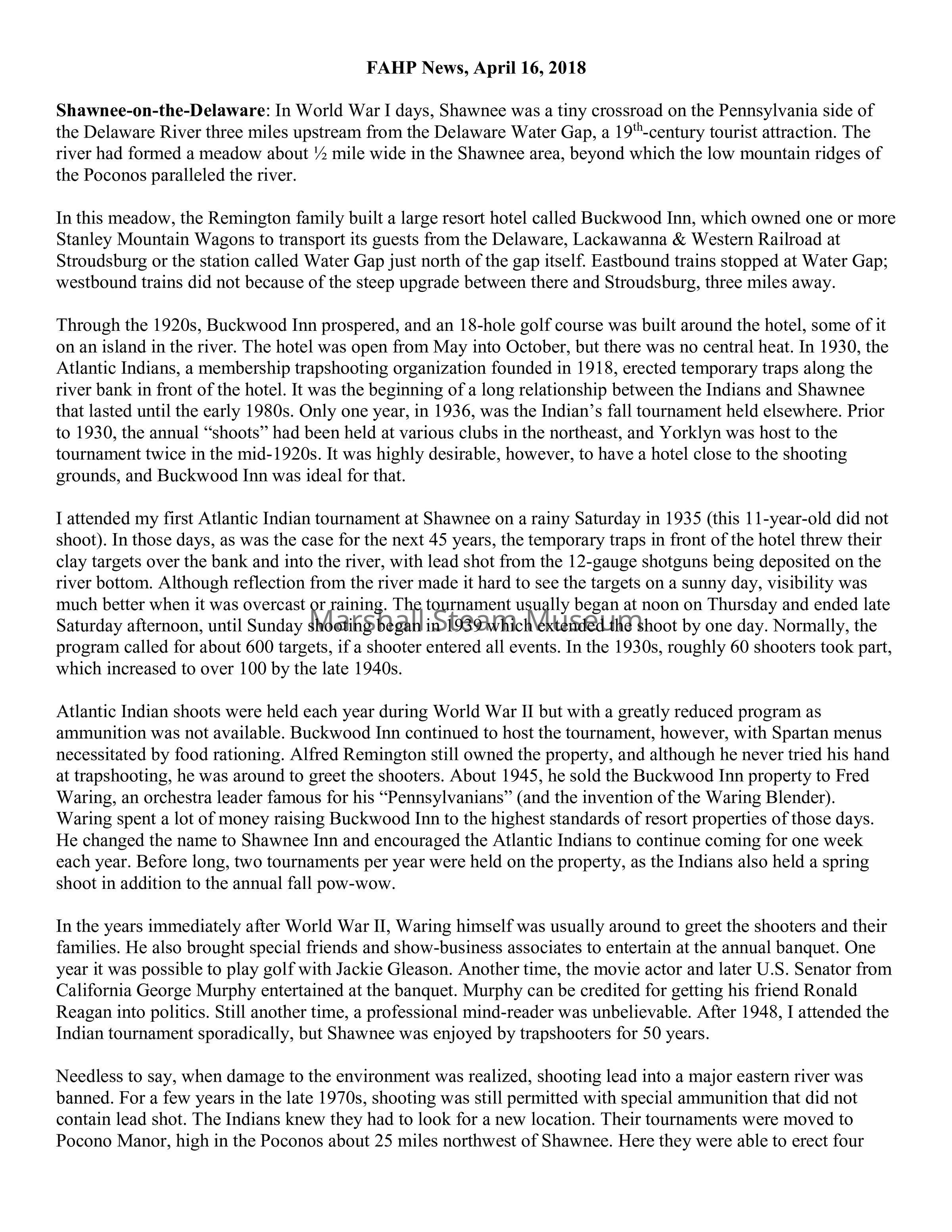 Atlantic Indian shoots were held each year during World War II but with a greatly reduced program as ammunition was not available. Buckwood Inn continued to host the tournament, however, with Spartan menus necessitated by food rationing. Alfred Remington still owned the property, and although he never tried his hand at trapshooting, he was around to greet the shooters. About 1945, he sold the Buckwood Inn property to Fred Waring, an orchestra leader famous for his “Pennsylvanians” (and the invention of the Waring Blender). Waring spent a lot of money raising Buckwood Inn to the highest standards of resort properties of those days. He changed the name to Shawnee Inn and encouraged the Atlantic Indians to continue coming for one week each year. Before long, two tournaments per year were held on the property, as the Indians also held a spring shoot in addition to the annual fall pow-wow.