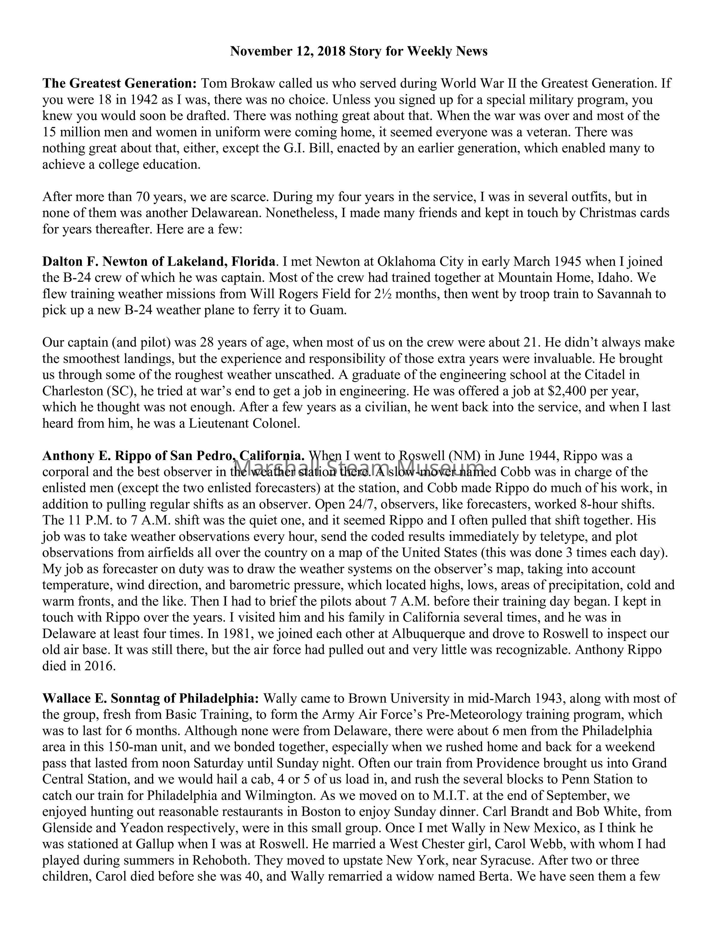 Anthony E. Rippo of San Pedro, California. When I went to Roswell (NM) in June 1944, Rippo was a corporal and the best observer in the weather station there. A slow-mover named Cobb was in charge of the enlisted men (except the two enlisted forecasters) at the station, and Cobb made Rippo do much of his work, in addition to pulling regular shifts as an observer. Open 24/7, observers, like forecasters, worked 8-hour shifts. The 11 P.M. to 7 A.M. shift was the quiet one, and it seemed Rippo and I often pulled that shift together. His job was to take weather observations every hour, send the coded results immediately by teletype, and plot observations from airfields all over the country on a map of the United States (this was done 3 times each day). My job as forecaster on duty was to draw the weather systems on the observer’s map, taking into account temperature, wind direction, and barometric pressure, which located highs, lows, areas of precipitation, cold and warm fronts, and the like. Then I had to brief the pilots about 7 A.M. before their training day began. I kept in touch with Rippo over the years. I visited him and his family in California several times, and he was in Delaware at least four times. In 1981, we joined each other at Albuquerque and drove to Roswell to inspect our old air base. It was still there, but the air force had pulled out and very little was recognizable. Anthony Rippo died in 2016.