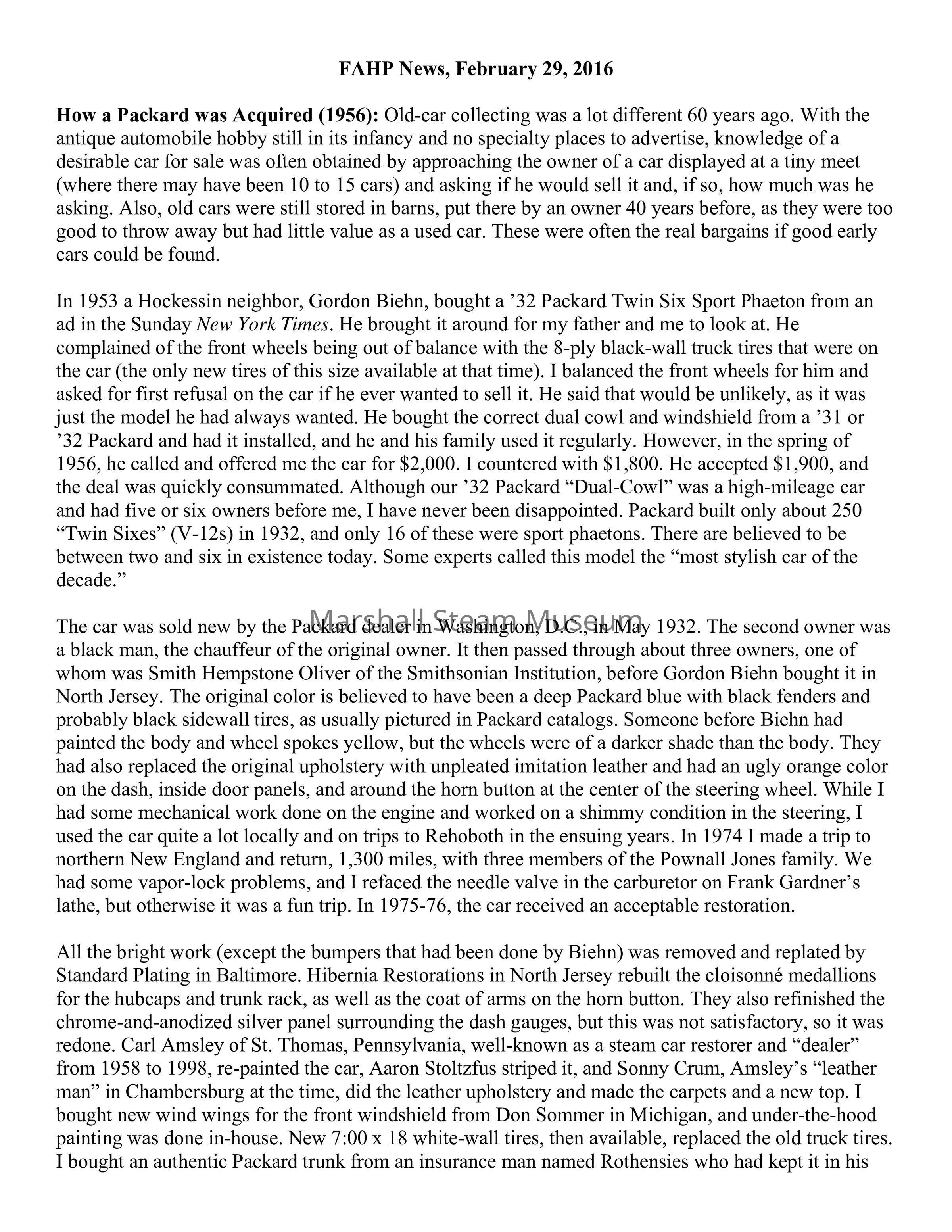 How a Packard was Acquired (1956): Old-car collecting was a lot different 60 years ago. With the antique automobile hobby still in its infancy and no specialty places to advertise, knowledge of a desirable car for sale was often obtained by approaching the owner of a car displayed at a tiny meet (where there may have been 10 to 15 cars) and asking if he would sell it and, if so, how much was he asking. Also, old cars were still stored in barns, put there by an owner 40 years before, as they were too good to throw away but had little value as a used car. These were often the real bargains if good early cars could be found.