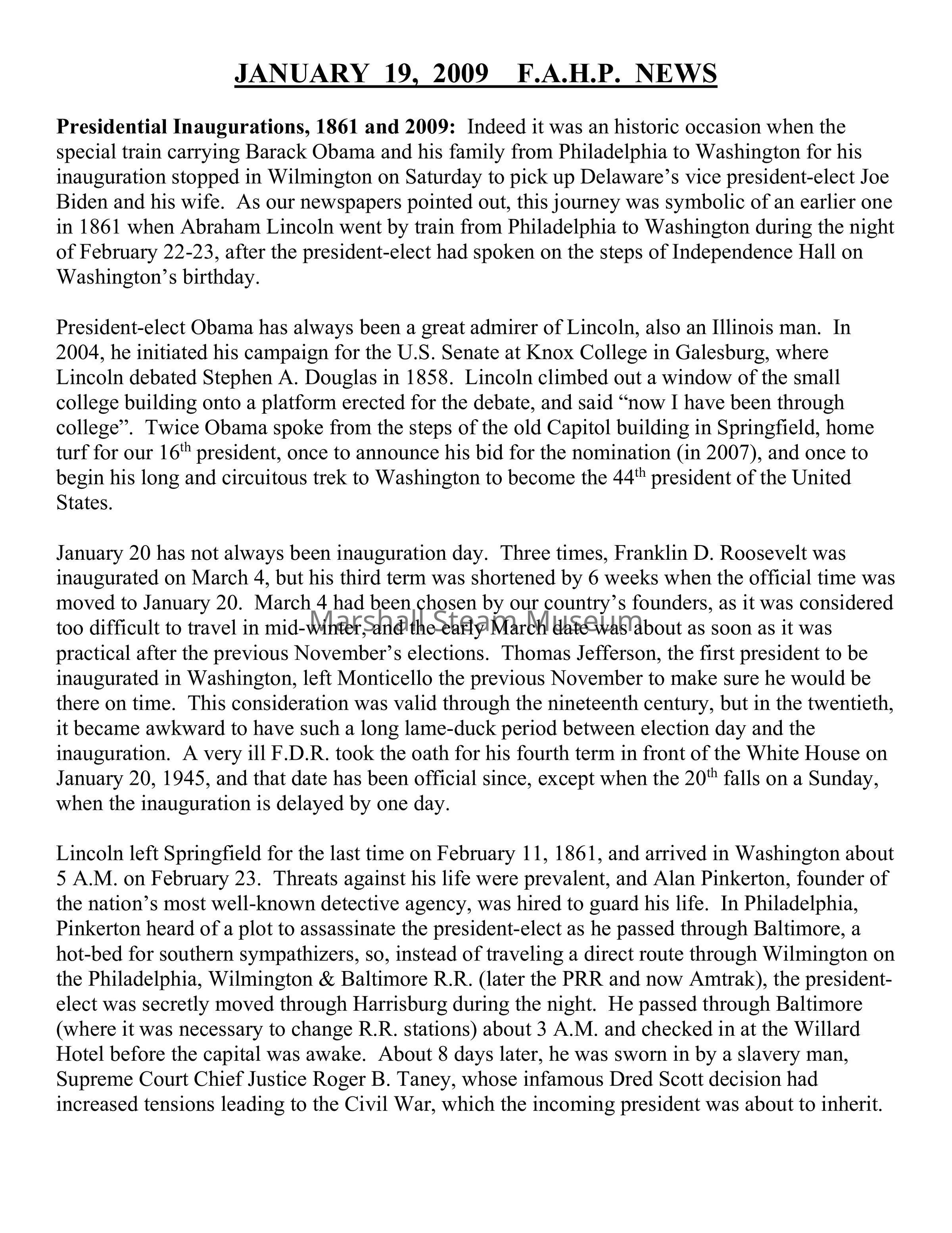 Presidential Inaugurations, 1861 and 2009: Indeed it was an historic occasion when the special train carrying Barack Obama and his family from Philadelphia to Washington for his inauguration stopped in Wilmington on Saturday to pick up Delaware’s vice president-elect Joe Biden and his wife. As our newspapers pointed out, this journey was symbolic of an earlier one in 1861 when Abraham Lincoln went by train from Philadelphia to Washington during the night of February 22-23, after the president-elect had spoken on the steps of Independence Hall on Washington’s birthday.