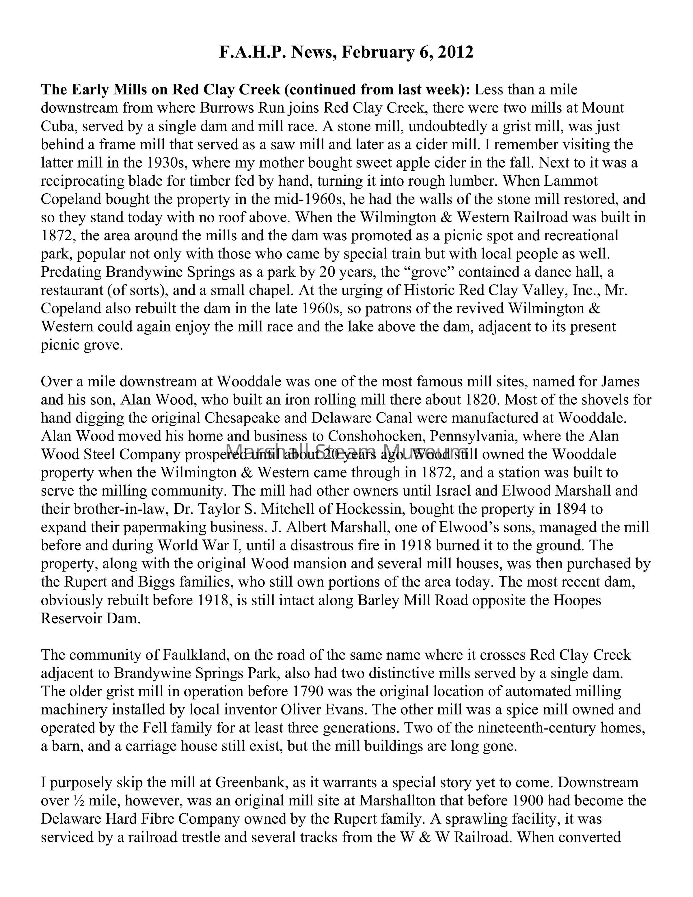 The Early Mills on Red Clay Creek (continued from last week): Less than a mile downstream from where Burrows Run joins Red Clay Creek, there were two mills at Mount Cuba, served by a single dam and mill race. A stone mill, undoubtedly a grist mill, was just behind a frame mill that served as a saw mill and later as a cider mill. I remember visiting the latter mill in the 1930s, where my mother bought sweet apple cider in the fall. Next to it was a reciprocating blade for timber fed by hand, turning it into rough lumber. When Lammot Copeland bought the property in the mid-1960s, he had the walls of the stone mill restored, and so they stand today with no roof above. When the Wilmington & Western Railroad was built in 1872, the area around the mills and the dam was promoted as a picnic spot and recreational park, popular not only with those who came by special train but with local people as well. Predating Brandywine Springs as a park by 20 years, the “grove” contained a dance hall, a restaurant (of sorts), and a small chapel. At the urging of Historic Red Clay Valley, Inc., Mr. Copeland also rebuilt the dam in the late 1960s, so patrons of the revived Wilmington & Western could again enjoy the mill race and the lake above the dam, adjacent to its present picnic grove.