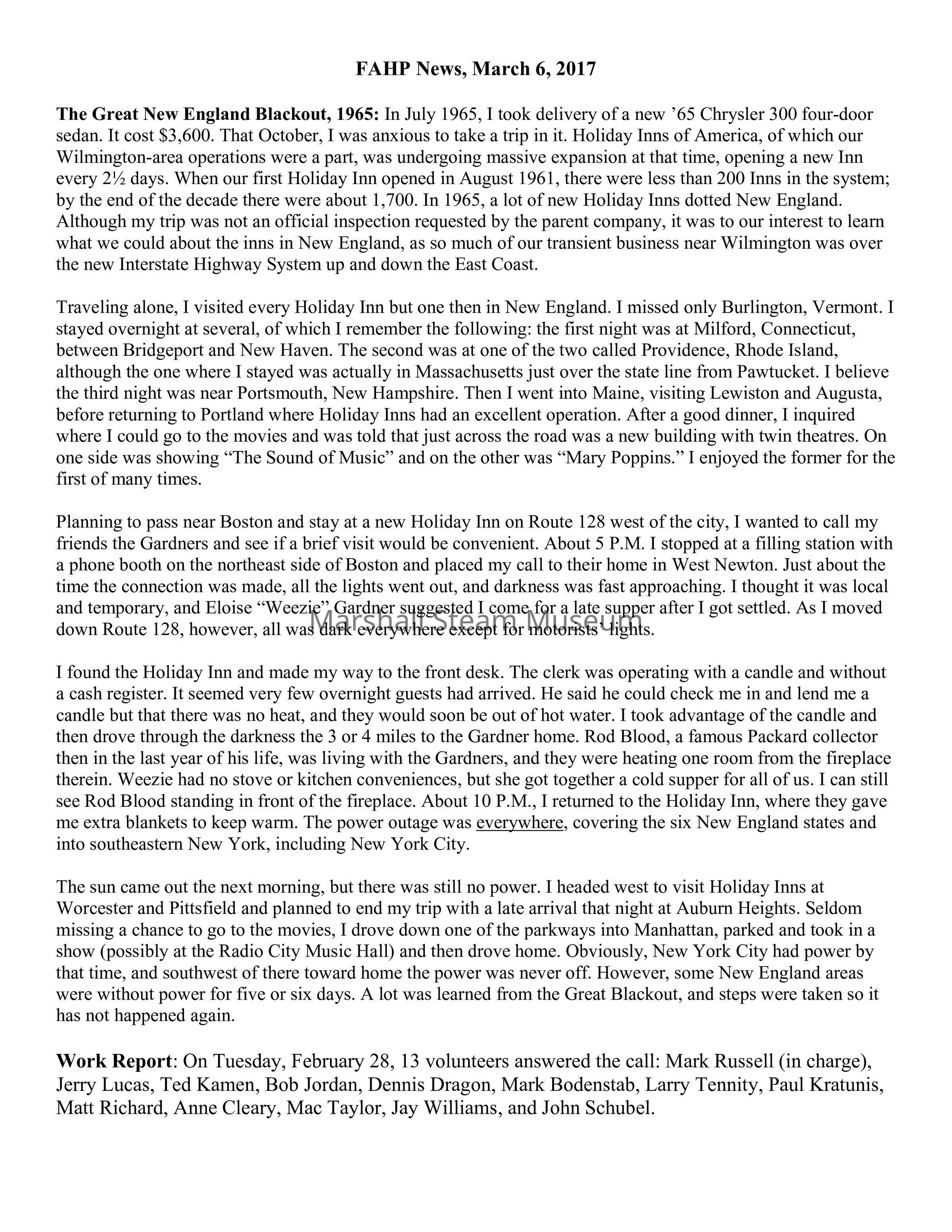 The Great New England Blackout, 1965: In July 1965, I took delivery of a new ’65 Chrysler 300 four-door sedan. It cost $3,600. That October, I was anxious to take a trip in it. Holiday Inns of America, of which our Wilmington-area operations were a part, was undergoing massive expansion at that time, opening a new Inn every 2½ days. When our first Holiday Inn opened in August 1961, there were less than 200 Inns in the system; by the end of the decade there were about 1,700. In 1965, a lot of new Holiday Inns dotted New England. Although my trip was not an official inspection requested by the parent company, it was to our interest to learn what we could about the inns in New England, as so much of our transient business near Wilmington was over the new Interstate Highway System up and down the East Coast.