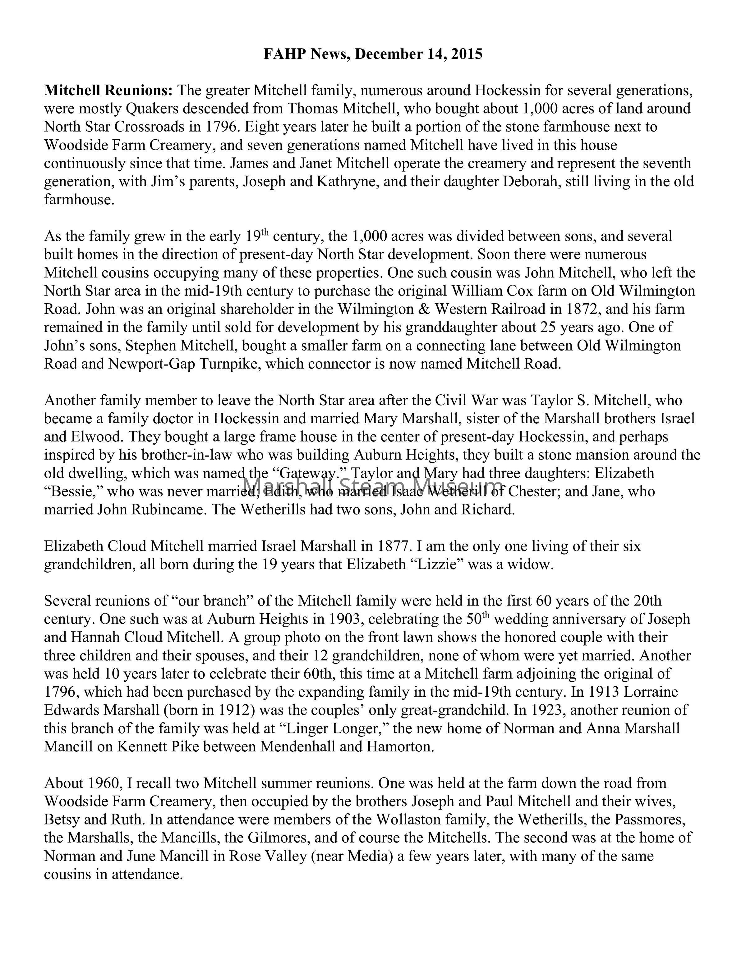 Several reunions of “our branch” of the Mitchell family were held in the first 60 years of the 20th century. One such was at Auburn Heights in 1903, celebrating the 50th wedding anniversary of Joseph and Hannah Cloud Mitchell. A group photo on the front lawn shows the honored couple with their three children and their spouses, and their 12 grandchildren, none of whom were yet married. Another was held 10 years later to celebrate their 60th, this time at a Mitchell farm adjoining the original of 1796, which had been purchased by the expanding family in the mid-19th century. In 1913 Lorraine Edwards Marshall (born in 1912) was the couples’ only great-grandchild. In 1923, another reunion of this branch of the family was held at “Linger Longer,” the new home of Norman and Anna Marshall Mancill on Kennett Pike between Mendenhall and Hamorton.