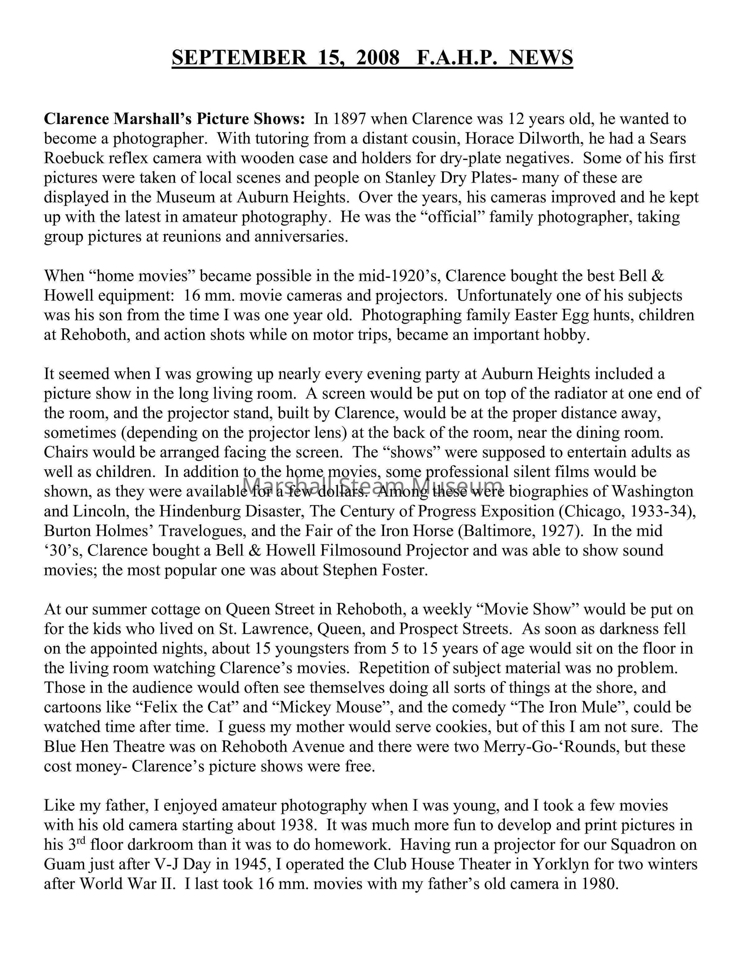 Clarence Marshall’s Picture Shows: In 1897 when Clarence was 12 years old, he wanted to become a photographer. With tutoring from a distant cousin, Horace Dilworth, he had a Sears Roebuck reflex camera with wooden case and holders for dry-plate negatives. Some of his first pictures were taken of local scenes and people on Stanley Dry Plates- many of these are displayed in the Museum at Auburn Heights. Over the years, his cameras improved and he kept up with the latest in amateur photography. He was the “official” family photographer, taking group pictures at reunions and anniversaries.