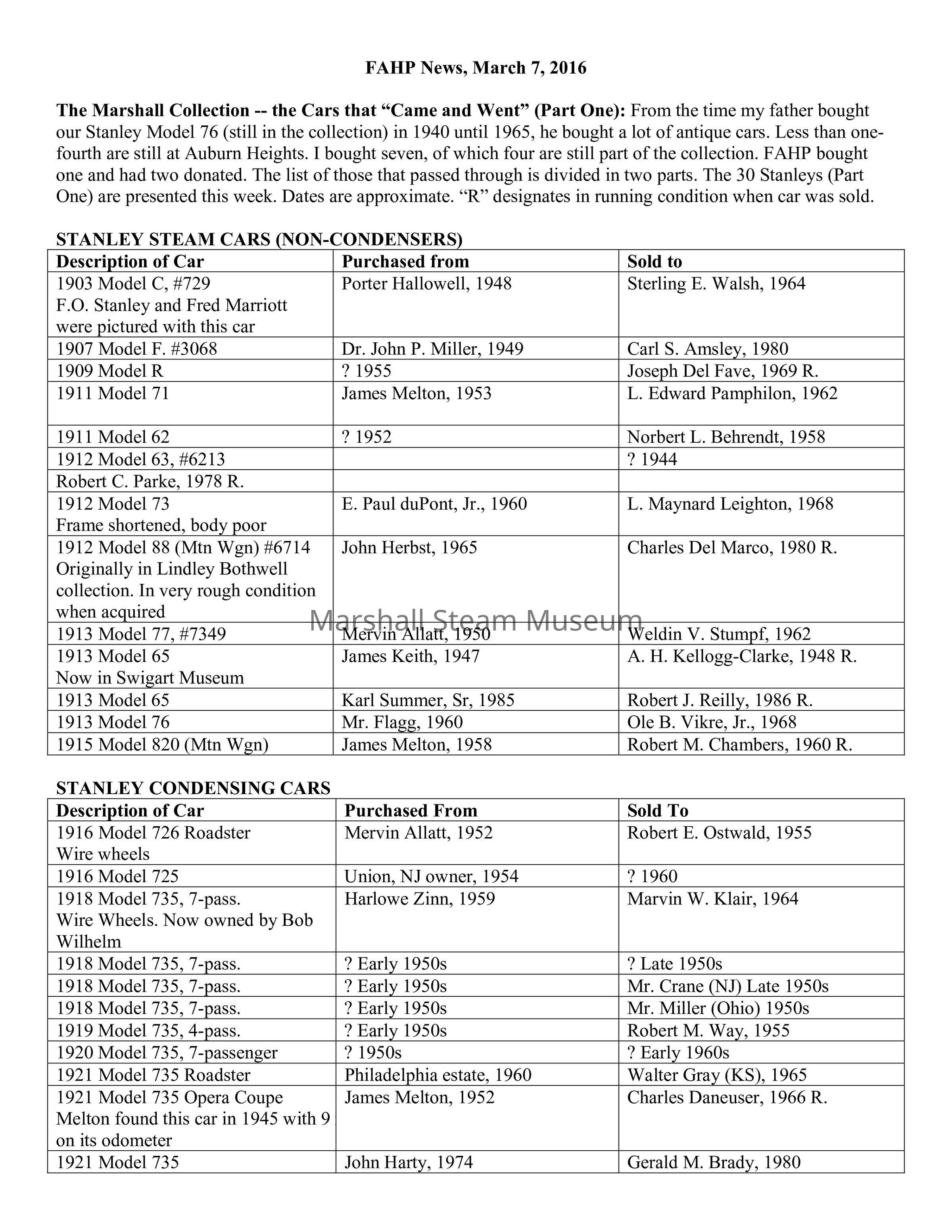 The Marshall Collection -- the Cars that “Came and Went” (Part One): From the time my father bought our Stanley Model 76 (still in the collection) in 1940 until 1965, he bought a lot of antique cars. Less than one-fourth are still at Auburn Heights. I bought seven, of which four are still part of the collection. FAHP bought one and had two donated. The list of those that passed through is divided in two parts. The 30 Stanleys (Part One) are presented this week. Dates are approximate. “R” designates in running condition when car was sold.
