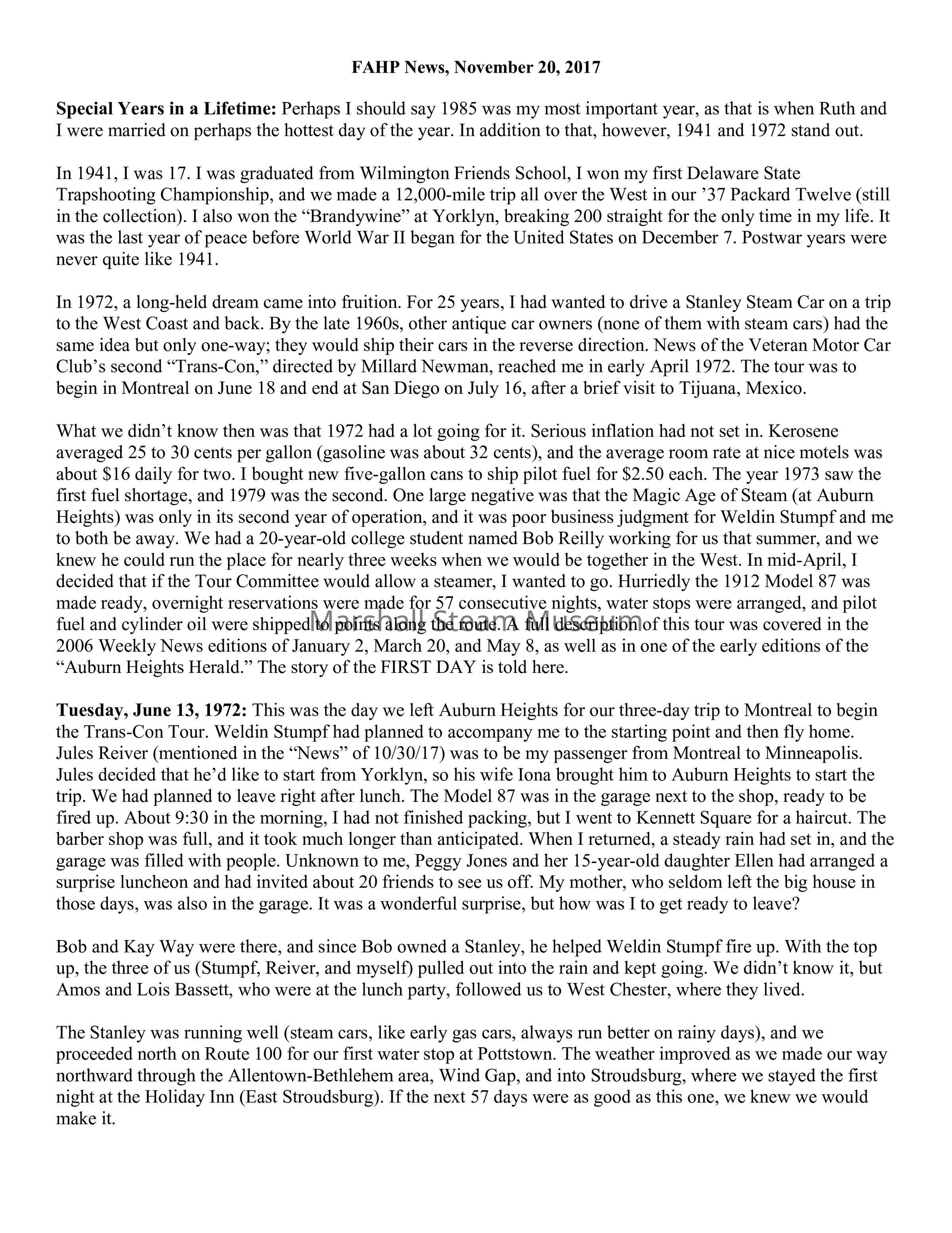 Tuesday, June 13, 1972: This was the day we left Auburn Heights for our three-day trip to Montreal to begin the Trans-Con Tour. Weldin Stumpf had planned to accompany me to the starting point and then fly home. Jules Reiver (mentioned in the “News” of 10/30/17) was to be my passenger from Montreal to Minneapolis. Jules decided that he’d like to start from Yorklyn, so his wife Iona brought him to Auburn Heights to start the trip. We had planned to leave right after lunch. The Model 87 was in the garage next to the shop, ready to be fired up. About 9:30 in the morning, I had not finished packing, but I went to Kennett Square for a haircut. The barber shop was full, and it took much longer than anticipated. When I returned, a steady rain had set in, and the garage was filled with people. Unknown to me, Peggy Jones and her 15-year-old daughter Ellen had arranged a surprise luncheon and had invited about 20 friends to see us off. My mother, who seldom left the big house in those days, was also in the garage. It was a wonderful surprise, but how was I to get ready to leave?