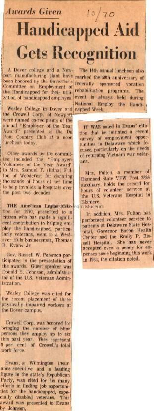 Newspaper clipping regarding Crowell Tape receiving Employer of the Year Award from the Governor's Committee on Employment of the Handicapped, 1970Collection