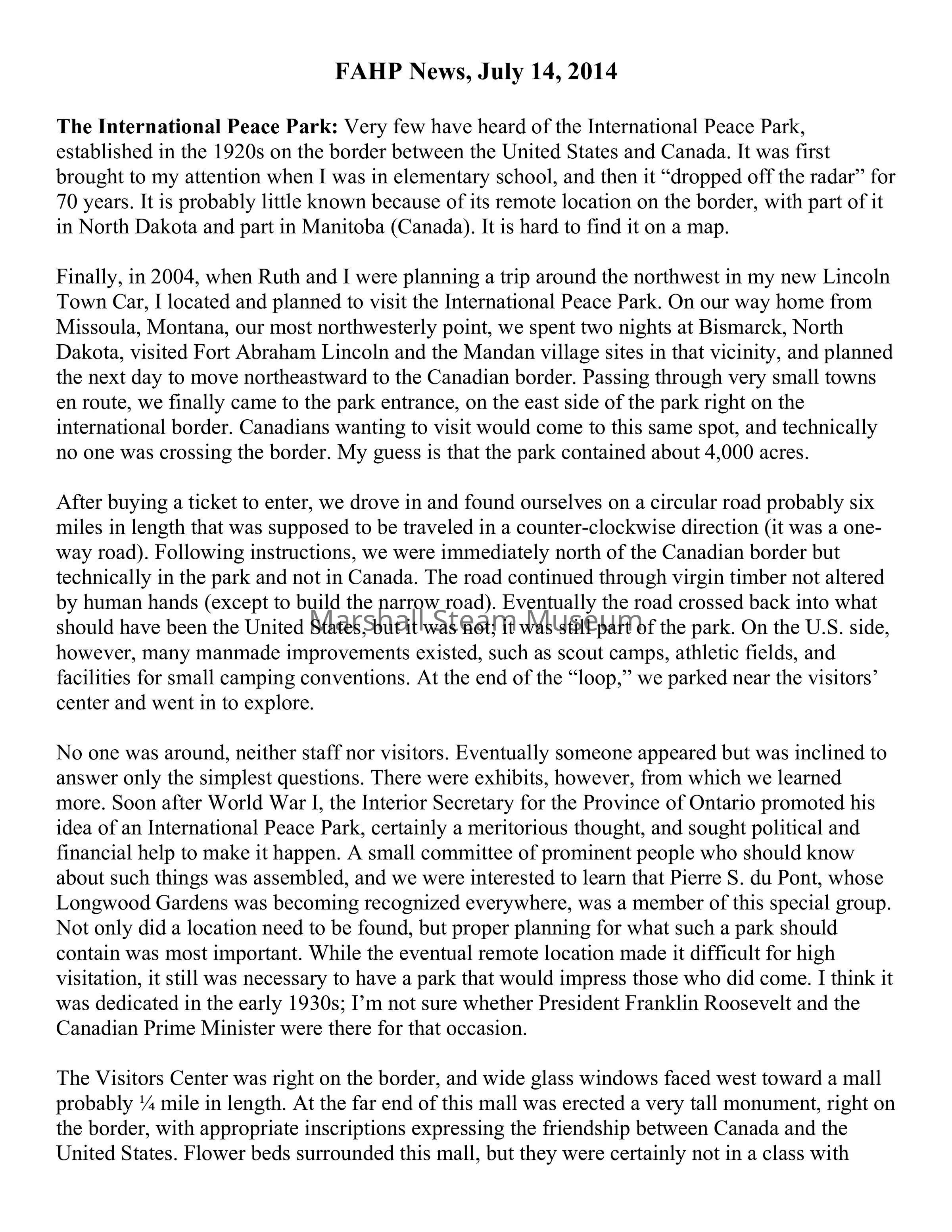 The International Peace Park: Very few have heard of the International Peace Park, established in the 1920s on the border between the United States and Canada. It was first brought to my attention when I was in elementary school, and then it “dropped off the radar” for 70 years. It is probably little known because of its remote location on the border, with part of it in North Dakota and part in Manitoba (Canada). It is hard to find it on a map.