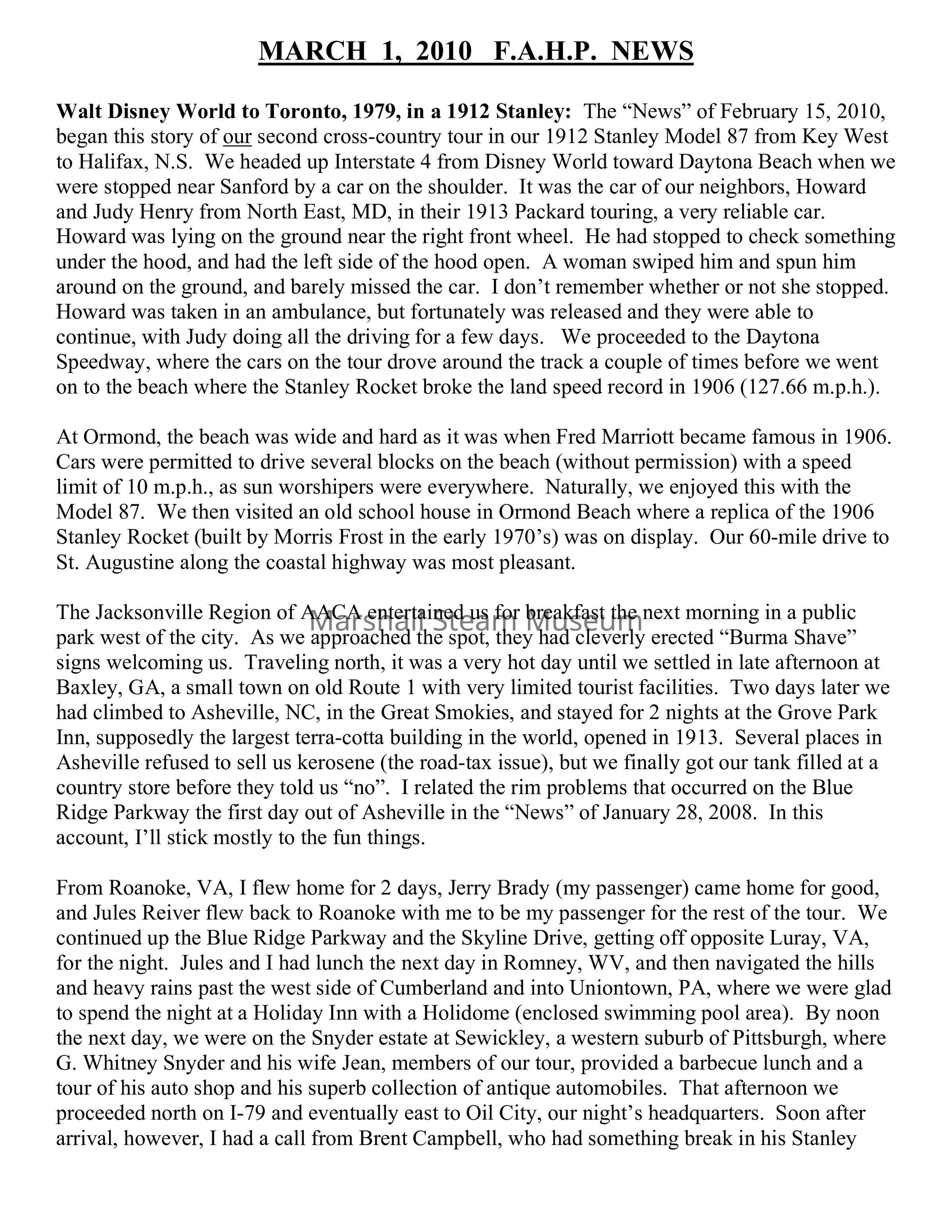 Walt Disney World to Toronto, 1979, in a 1912 Stanley: The “News” of February 15, 2010, began this story of our second cross-country tour in our 1912 Stanley Model 87 from Key West to Halifax, N.S. We headed up Interstate 4 from Disney World toward Daytona Beach when we were stopped near Sanford by a car on the shoulder. It was the car of our neighbors, Howard and Judy Henry from North East, MD, in their 1913 Packard touring, a very reliable car. Howard was lying on the ground near the right front wheel. He had stopped to check something under the hood, and had the left side of the hood open. A woman swiped him and spun him around on the ground, and barely missed the car. I don’t remember whether or not she stopped. Howard was taken in an ambulance, but fortunately was released and they were able to continue, with Judy doing all the driving for a few days. We proceeded to the Daytona Speedway, where the cars on the tour drove around the track a couple of times before we went on to the beach where the Stanley Rocket broke the land speed record in 1906 (127.66 m.p.h.).