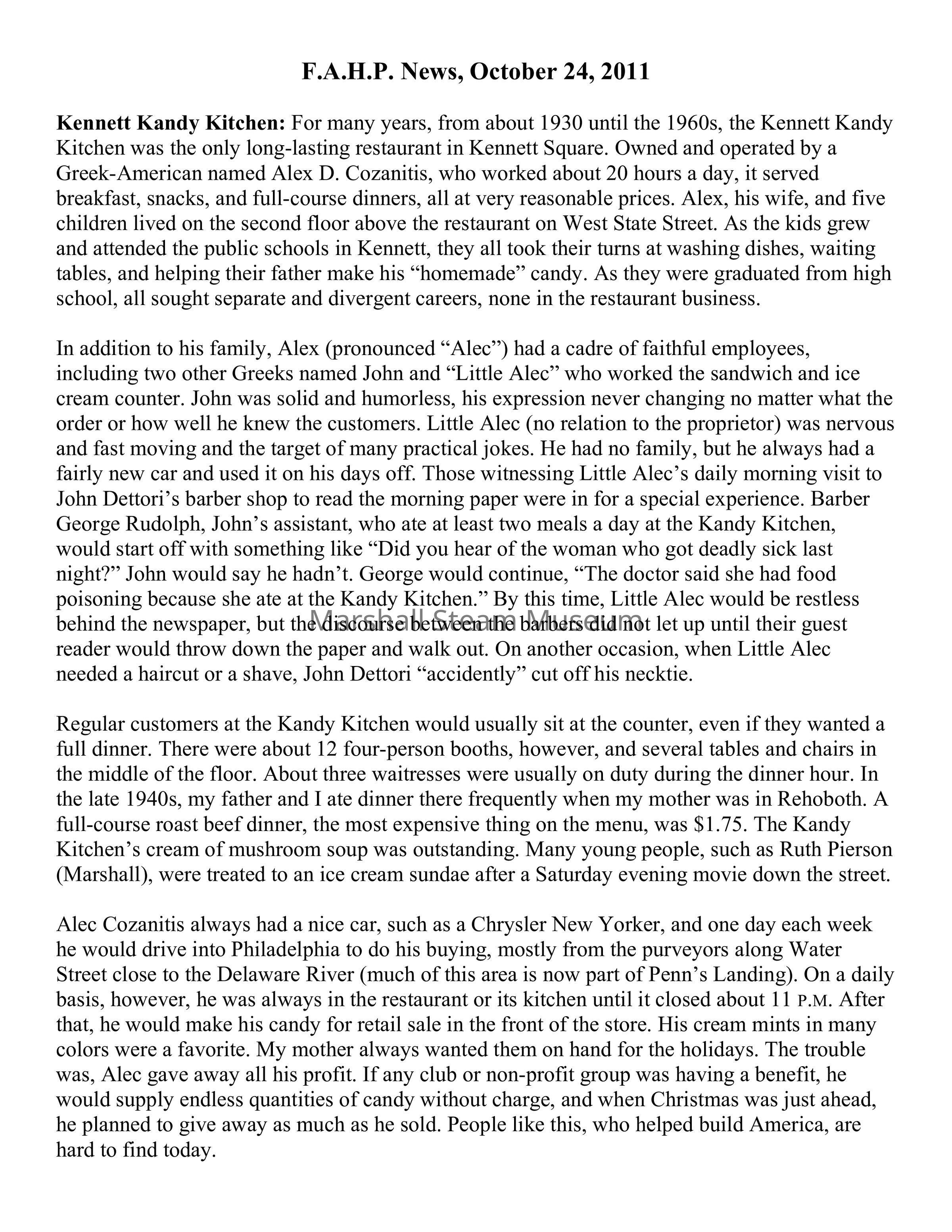 Kennett Kandy Kitchen: For many years, from about 1930 until the 1960s, the Kennett Kandy Kitchen was the only long-lasting restaurant in Kennett Square. Owned and operated by a Greek-American named Alex D. Cozanitis, who worked about 20 hours a day, it served breakfast, snacks, and full-course dinners, all at very reasonable prices. Alex, his wife, and five children lived on the second floor above the restaurant on West State Street. As the kids grew and attended the public schools in Kennett, they all took their turns at washing dishes, waiting tables, and helping their father make his “homemade” candy. As they were graduated from high school, all sought separate and divergent careers, none in the restaurant business.