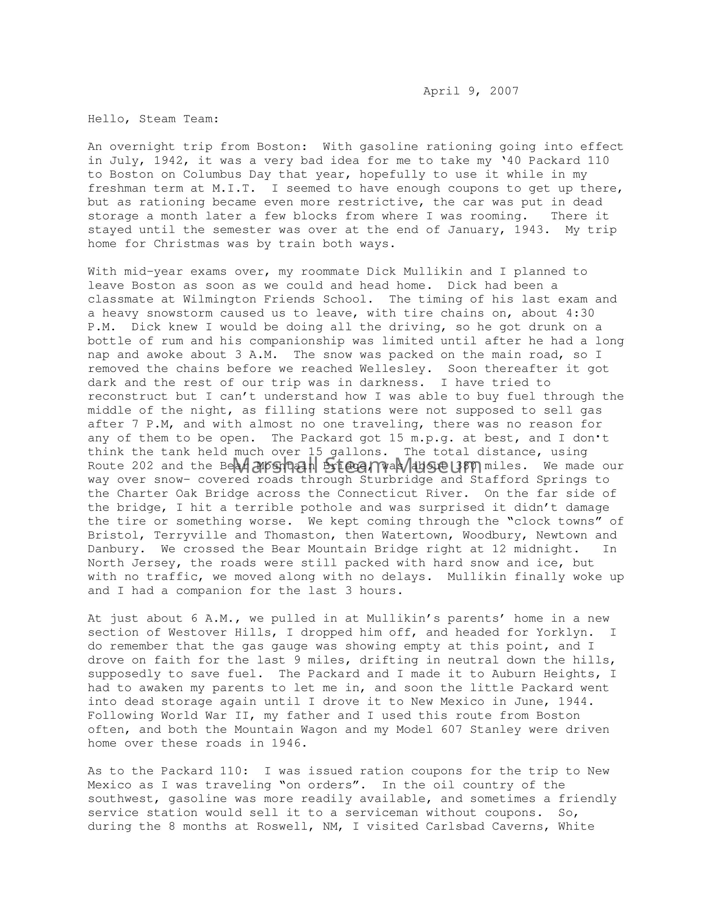At just about 6 A.M., we pulled in at Mullikin’s parents’ home in a new section of Westover Hills, I dropped him off, and headed for Yorklyn. I do remember that the gas gauge was showing empty at this point, and I drove on faith for the last 9 miles, drifting in neutral down the hills, supposedly to save fuel. The Packard and I made it to Auburn Heights, I had to awaken my parents to let me in, and soon the little Packard went into dead storage again until I drove it to New Mexico in June, 1944. Following World War II, my father and I used this route from Boston often, and both the Mountain Wagon and my Model 607 Stanley were driven home over these roads in 1946.