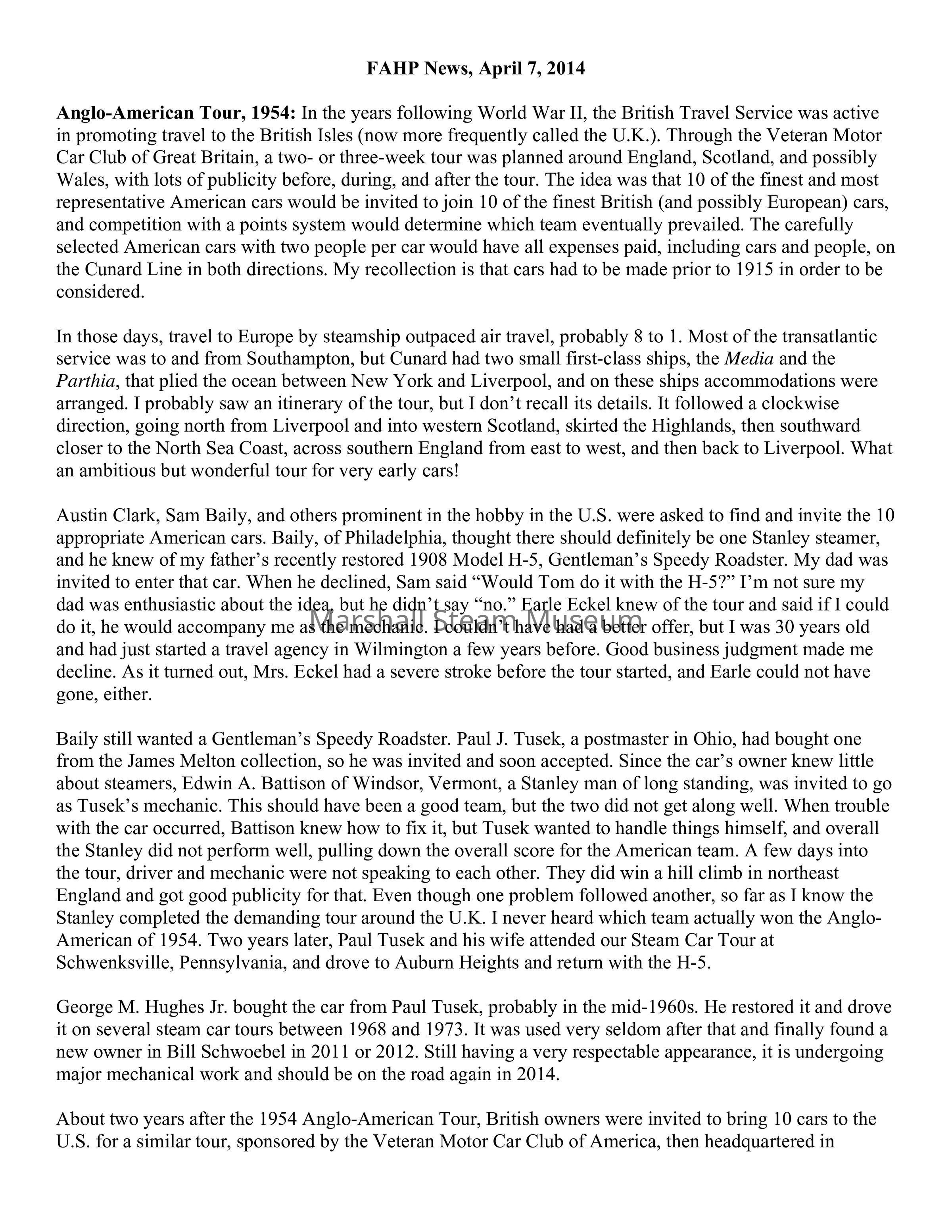 Anglo-American Tour, 1954: In the years following World War II, the British Travel Service was active in promoting travel to the British Isles (now more frequently called the U.K.). Through the Veteran Motor Car Club of Great Britain, a two- or three-week tour was planned around England, Scotland, and possibly Wales, with lots of publicity before, during, and after the tour. The idea was that 10 of the finest and most representative American cars would be invited to join 10 of the finest British (and possibly European) cars, and competition with a points system would determine which team eventually prevailed. The carefully selected American cars with two people per car would have all expenses paid, including cars and people, on the Cunard Line in both directions. My recollection is that cars had to be made prior to 1915 in order to be considered.