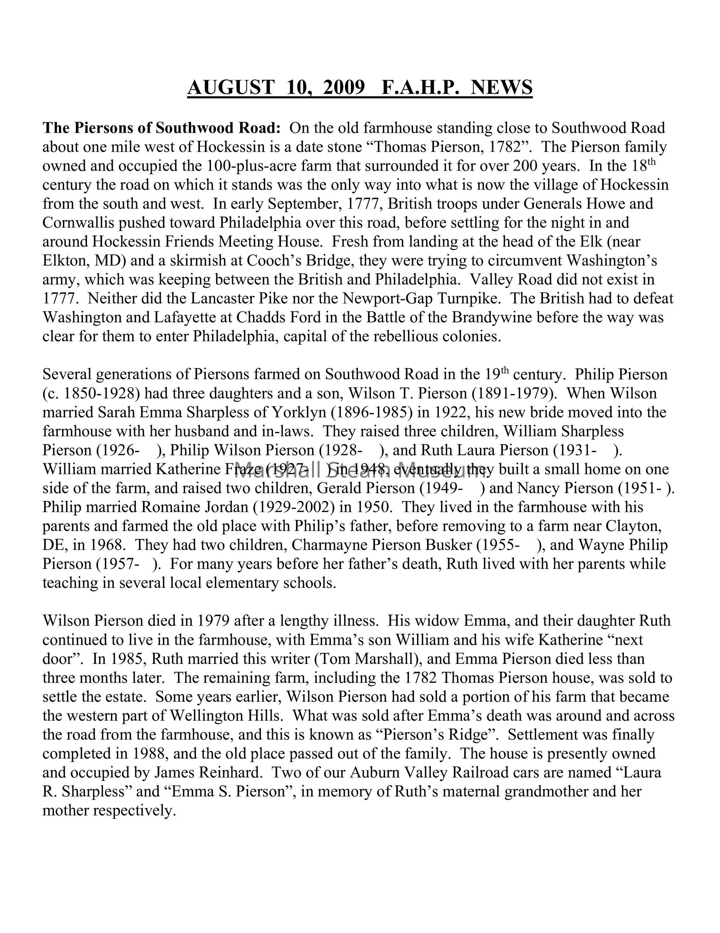 Several generations of Piersons farmed on Southwood Road in the 19th century. Philip Pierson (c. 1850-1928) had three daughters and a son, Wilson T. Pierson (1891-1979). When Wilson married Sarah Emma Sharpless of Yorklyn (1896-1985) in 1922, his new bride moved into the farmhouse with her husband and in-laws. They raised three children, William Sharpless Pierson (1926- ), Philip Wilson Pierson (1928- ), and Ruth Laura Pierson (1931- ). William married Katherine Fraze (1927- ) in 1948, eventually they built a small home on one side of the farm, and raised two children, Gerald Pierson (1949- ) and Nancy Pierson (1951- ). Philip married Romaine Jordan (1929-2002) in 1950. They lived in the farmhouse with his parents and farmed the old place with Philip’s father, before removing to a farm near Clayton, DE, in 1968. They had two children, Charmayne Pierson Busker (1955- ), and Wayne Philip Pierson (1957- ). For many years before her father’s death, Ruth lived with her parents while teaching in several local elementary schools.