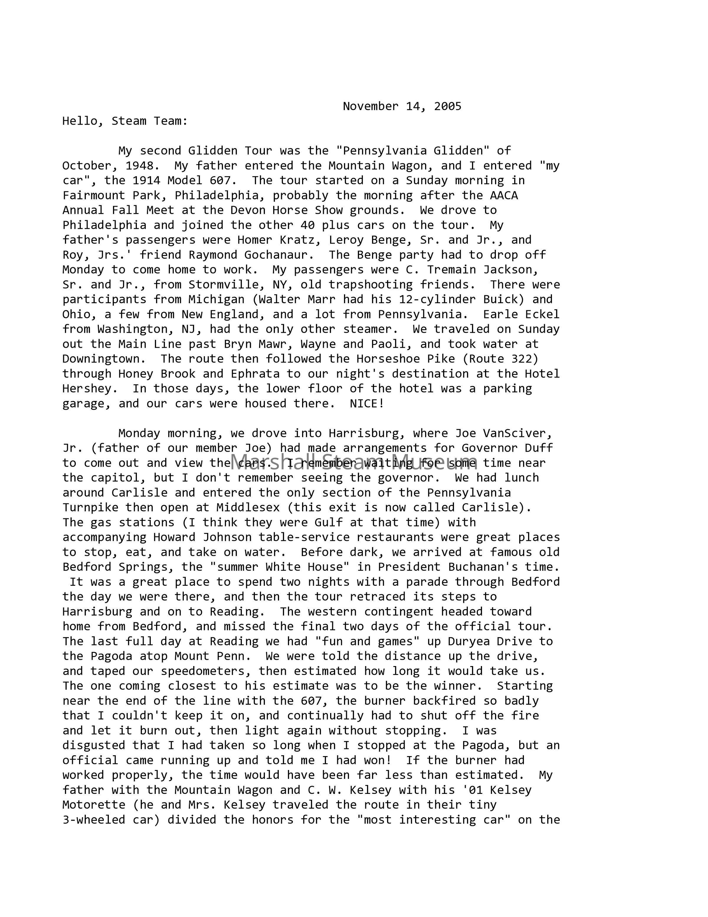 My second Glidden Tour was the "Pennsylvania Glidden" of October, 1948. My father entered the Mountain Wagon, and I entered "my car", the 1914 Model 607. The tour started on a Sunday morning in Fairmount Park, Philadelphia, probably the morning after the AACA Annual Fall Meet at the Devon Horse Show grounds. We drove to Philadelphia and joined the other 40 plus cars on the tour. My father's passengers were Homer Kratz, Leroy Benge, Sr. and Jr., and Roy, Jrs.' friend Raymond Gochanaur. The Benge party had to drop off Monday to come home to work. My passengers were C. Tremain Jackson, Sr. and Jr., from Stormville, NY, old trapshooting friends. There were participants from Michigan (Walter Marr had his 12-cylinder Buick) and Ohio, a few from New England, and a lot from Pennsylvania. Earle Eckel from Washington, NJ, had the only other steamer. We traveled on Sunday out the Main Line past Bryn Mawr, Wayne and Paoli, and took water at Downingtown. The route then followed the Horseshoe Pike (Route 322) through Honey Brook and Ephrata to our night's destination at the Hotel Hershey. In those days, the lower floor of the hotel was a parking garage, and our cars were housed there. NICE! Monday morning, we drove into Harrisburg, where Joe VanSciver, Jr. (father of our member Joe) had made arrangements for Governor Duff to come out and view the cars. I remember waiting for some time near the capitol, but I don't remember seeing the governor. We had lunch around Carlisle and entered the only section of the Pennsylvania Turnpike then open at Middlesex (this exit is now called Carlisle). The gas stations (I think they were Gulf at that time) with accompanying Howard Johnson table-service restaurants were great places to stop, eat, and take on water. Before dark, we arrived at famous old Bedford Springs, the "summer White House" in President Buchanan's time. It was a great place to spend two nights with a parade through Bedford the day we were there, and then the tour retraced its steps to Harrisburg and on to Reading. The western contingent headed toward home from Bedford, and missed the final two days of the official tour. The last full day at Reading we had "fun and games" up Duryea Drive to the Pagoda atop Mount Penn. We were told the distance up the drive, and taped our speedometers, then estimated how long it would take us. The one coming closest to his estimate was to be the winner. Starting near the end of the line with the 607, the burner backfired so badly that I couldn't keep it on, and continually had to shut off the fire and let it burn out, then light again without stopping. I was disgusted that I had taken so long when I stopped at the Pagoda, but an official came running up and told me I had won! If the burner had worked properly, the time would have been far less than estimated. My father with the Mountain Wagon and C. W. Kelsey with his '01 Kelsey Motorette (he and Mrs. Kelsey traveled the route in their tiny 3-wheeled car) divided the honors for the "most interesting car" on the tour. Last week, activity varied at our work sessions. After another determined try, we have given up trying to mount the clincher tire on the Model H-5. I'd like to ask old pro Mike May to look at it when he's here this week, and unless he has the solution to our problem, I'll call Coker Tire Company and see what they suggest. Chuck continues his excellent work in the organization of the shop, and Dale and Teddy Simpkins have worked on two of our standard-gauge Lionel locomotives, and report that one is doing fine; the other needs a new gear. Bill Schwoebel and his lantern brigade have done a lot of work in getting a number of his kerosene lanterns working for our November 19 event, and he, Richard, Anne, Brian, Ruth, and the Robisons worked on luminaries and other lighting for the evening event. Richard is in charge of the five historians who will be giving walking tours around the property, with each one of the five taking a short 5-minute segment of the total tour. Steve and Bill have done some track work and Steve checked out the locomotives' lights and changed the grate in the 401. Rose Ann, Butch, Ed, Kathy Beck, and their helpers will take care of ticket sales, gift shop, hot chocolate, and popcorn. And of course the steam train operation is in capable hands. Like all special events, November 19 requires a lot of planning and preliminary work, and we hope it turns out well and is well-attended. Remember, Saturday night, 6:30 to 9:00 P.M. This is our last special event of the year- after this week, we hope to get down to productive mechanical projects for the remainder of the winter. This is "meetings" week again, although at present the Board meeting on Thursday evening, 11/17, and possibly a Collections Committee meeting on Wednesday evening are the only ones scheduled. Tuesday's work session will be focused on another "dry run" for the 11/19 lighting around the grounds, and Thursday's will be tuning up the Museum and roping off the cars. The Board meeting will be in the house, so the Museum will be available for refinement. It's planned to have the Model 76 alongside the house with all gas lights shining during the time our visitors are here for our "Auburn Heights by Lantern Light". Last week, we mentioned the kind invitation from Rob and Chevonne Robison for a holiday party at their home on Yorklyn Road on Saturday, December 10. Remember they would like to know by December 3 whether or not you can attend, so please let them hear from you. Lost and Found: From our October 30 "Steamin' Sunday", a stroller, a nice camera case with accessories, a cap, and a pair of sun glasses are unclaimed. In the lost department are a battery drill from the shop, an accompanying flashlight, and the prick-punches from the magnet rack. These are probably around but misplaced. Thanks for all favors, past, present, and future. Tom