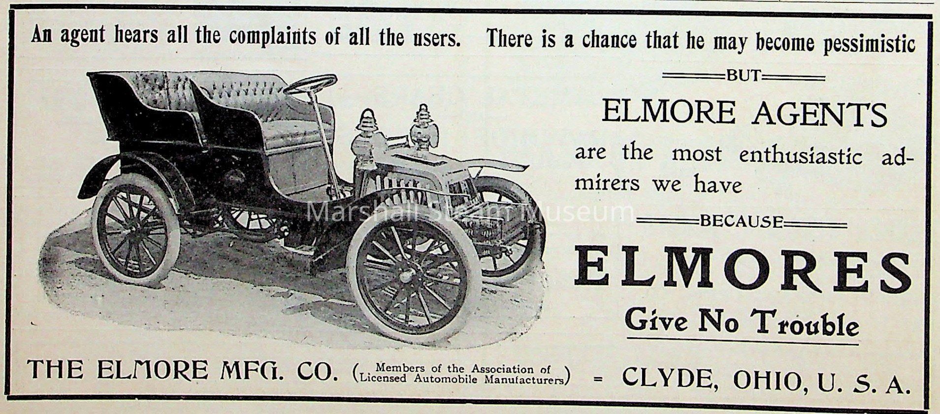1903 advertisement for Elmores Manufacturing scanned excerpt from December, 1903, issue of "The Automobile" magazine
