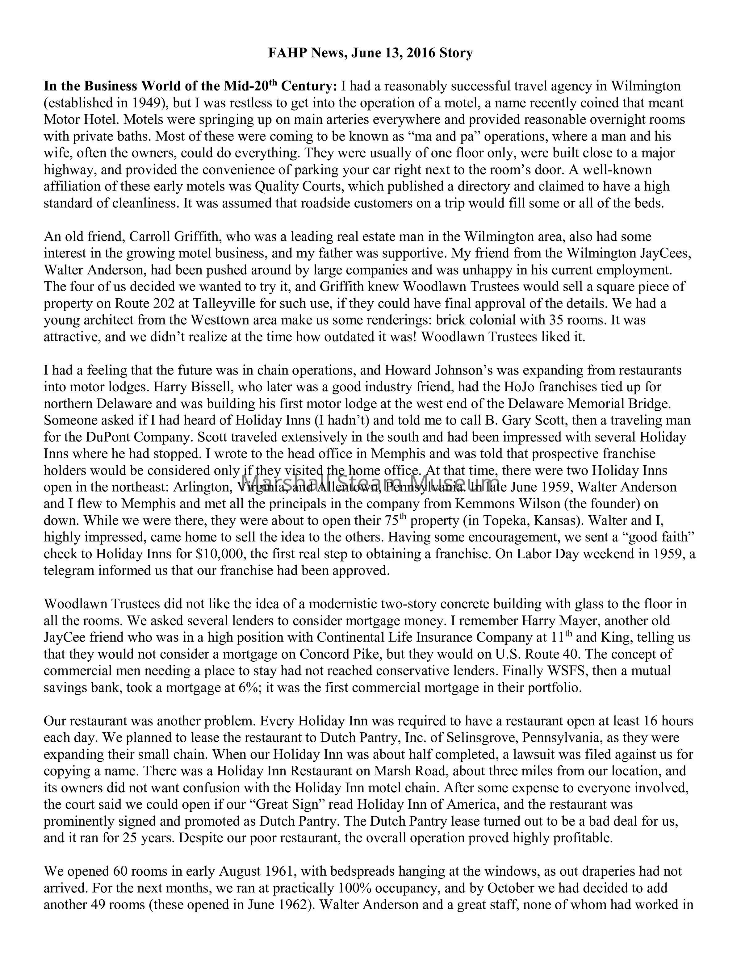 I had a feeling that the future was in chain operations, and Howard Johnson’s was expanding from restaurants into motor lodges. Harry Bissell, who later was a good industry friend, had the HoJo franchises tied up for northern Delaware and was building his first motor lodge at the west end of the Delaware Memorial Bridge. Someone asked if I had heard of Holiday Inns (I hadn’t) and told me to call B. Gary Scott, then a traveling man for the DuPont Company. Scott traveled extensively in the south and had been impressed with several Holiday Inns where he had stopped. I wrote to the head office in Memphis and was told that prospective franchise holders would be considered only if they visited the home office. At that time, there were two Holiday Inns open in the northeast: Arlington, Virginia, and Allentown, Pennsylvania. In late June 1959, Walter Anderson and I flew to Memphis and met all the principals in the company from Kemmons Wilson (the founder) on down. While we were there, they were about to open their 75th property (in Topeka, Kansas). Walter and I, highly impressed, came home to sell the idea to the others. Having some encouragement, we sent a “good faith” check to Holiday Inns for $10,000, the first real step to obtaining a franchise. On Labor Day weekend in 1959, a telegram informed us that our franchise had been approved.