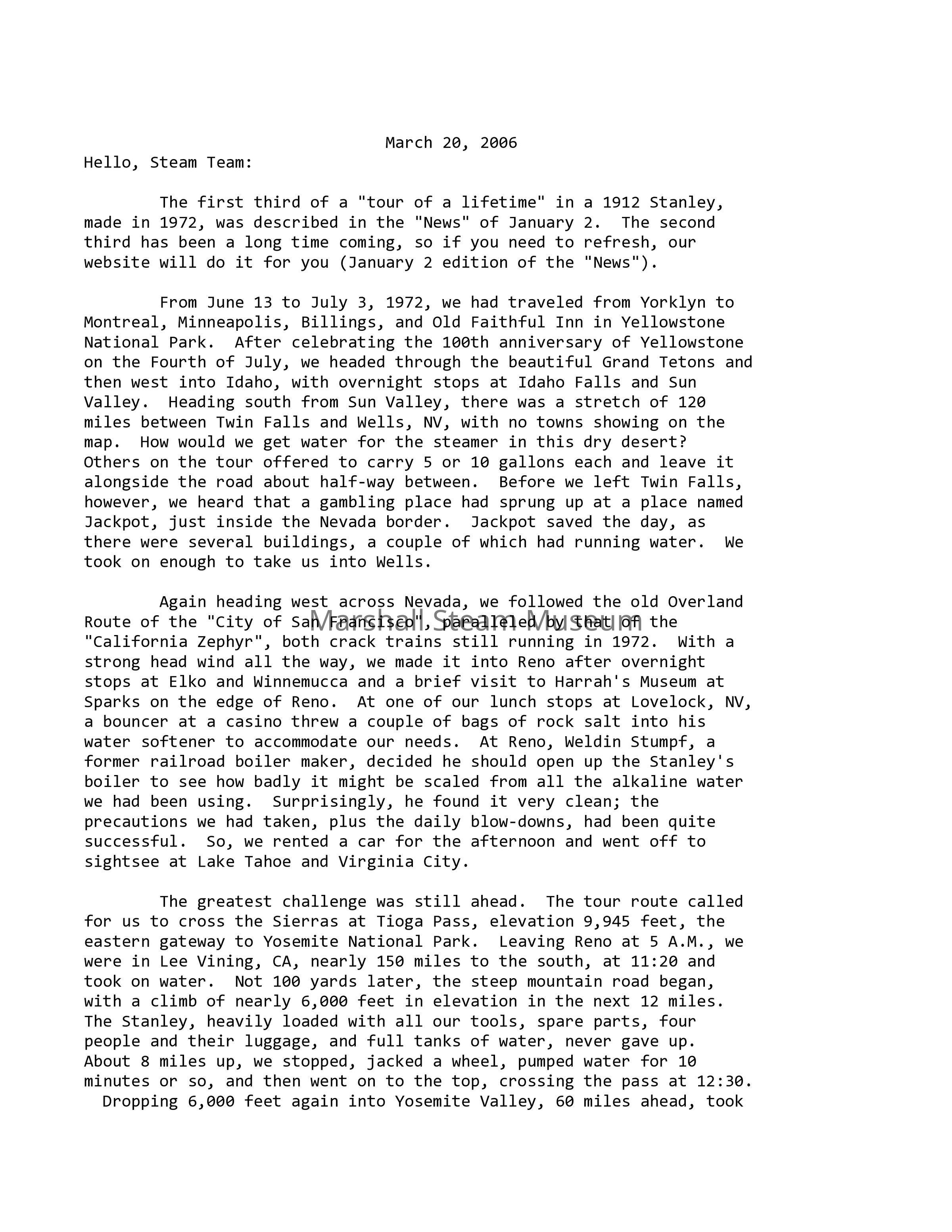 The first third of a "tour of a lifetime" in a 1912 Stanley, made in 1972, was described in the "News" of January 2. The second third has been a long time coming, so if you need to refresh, our website will do it for you (January 2 edition of the "News").