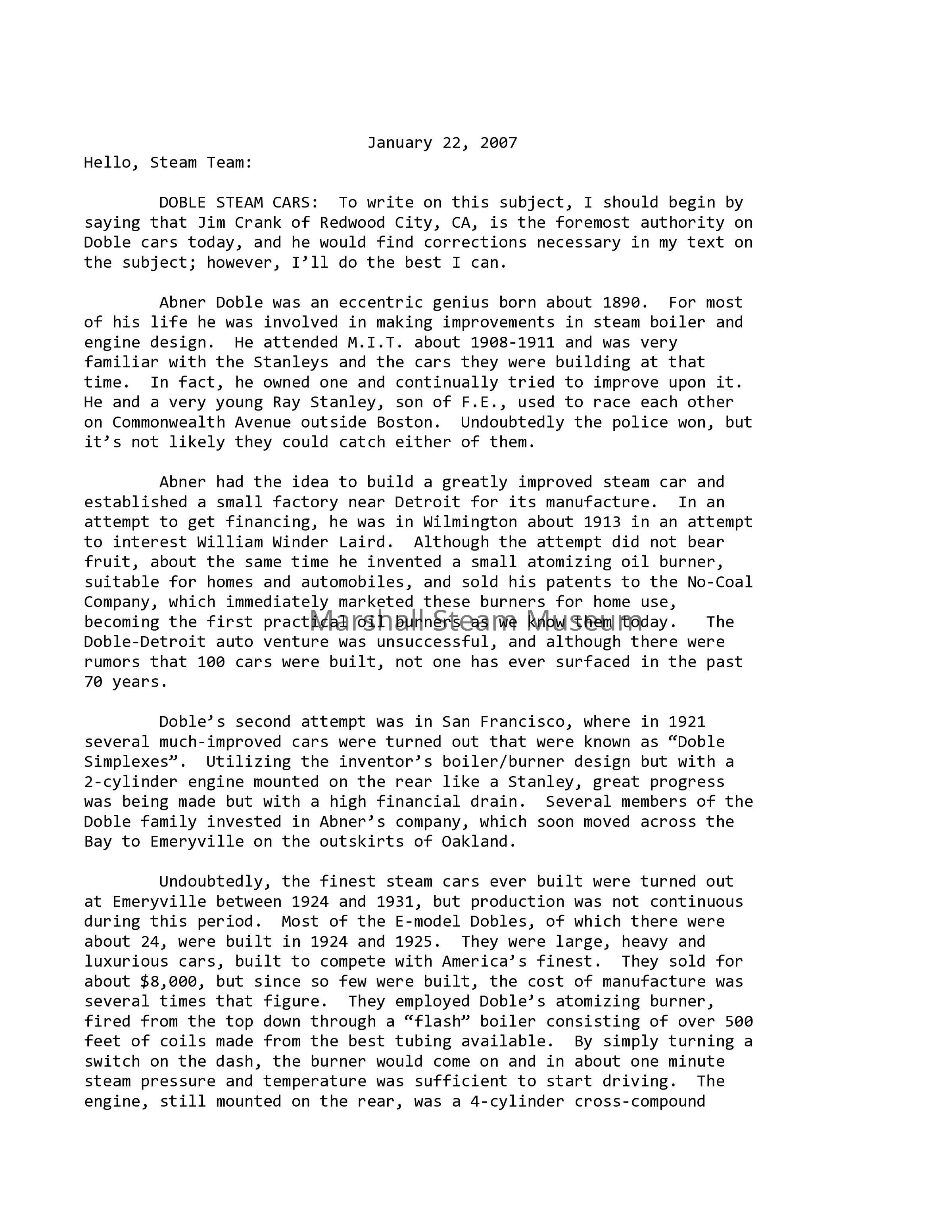 DOBLE STEAM CARS: To write on this subject, I should begin by saying that Jim Crank of Redwood City, CA, is the foremost authority on Doble cars today, and he would find corrections necessary in my text on the subject; however, I’ll do the best I can.