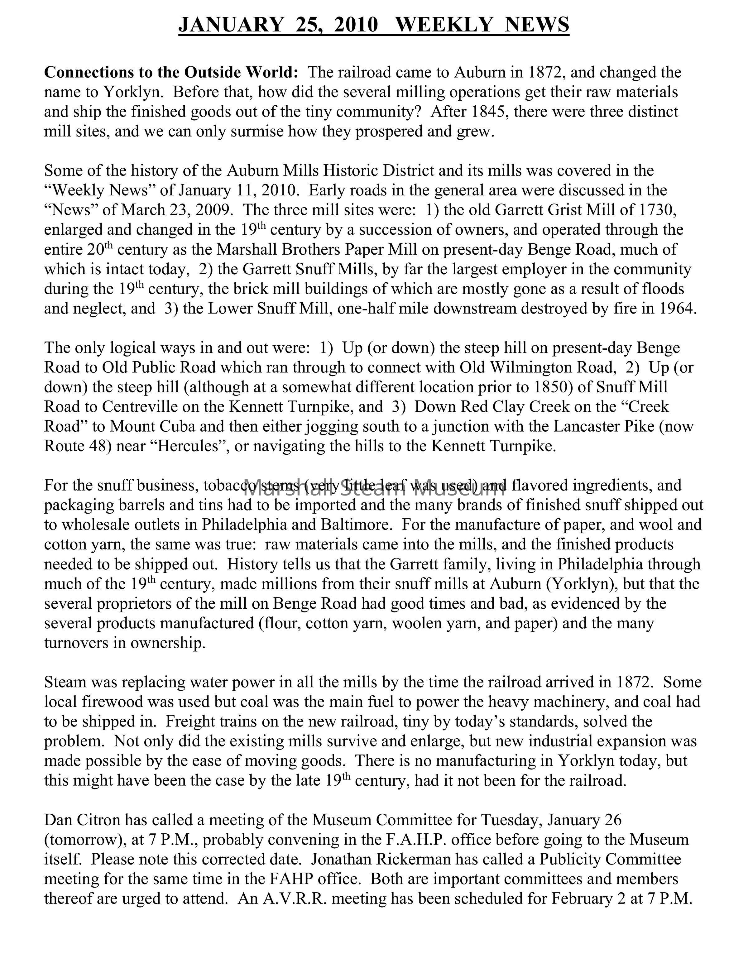 Dan Citron has called a meeting of the Museum Committee for Tuesday, January 26 (tomorrow), at 7 P.M., probably convening in the F.A.H.P. office before going to the Museum itself. Please note this corrected date. Jonathan Rickerman has called a Publicity Committee meeting for the same time in the FAHP office. Both are important committees and members thereof are urged to attend. An A.V.R.R. meeting has been scheduled for February 2 at 7 P.M.