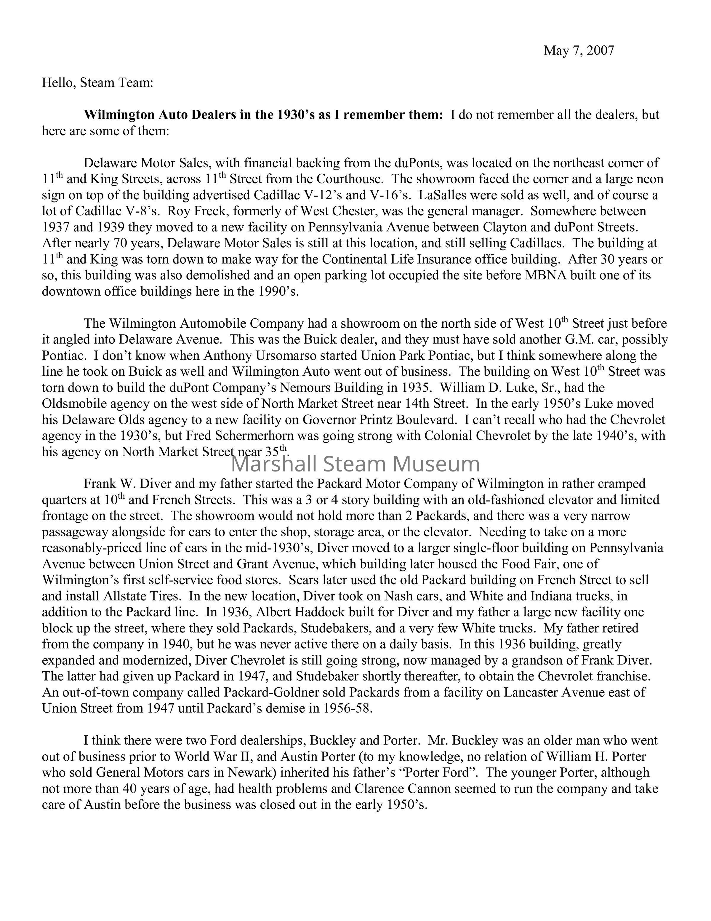 Frank W. Diver and my father started the Packard Motor Company of Wilmington in rather cramped quarters at 10th and French Streets. This was a 3 or 4 story building with an old-fashioned elevator and limited frontage on the street. The showroom would not hold more than 2 Packards, and there was a very narrow passageway alongside for cars to enter the shop, storage area, or the elevator. Needing to take on a more reasonably-priced line of cars in the mid-1930’s, Diver moved to a larger single-floor building on Pennsylvania Avenue between Union Street and Grant Avenue, which building later housed the Food Fair, one of Wilmington’s first self-service food stores. Sears later used the old Packard building on French Street to sell and install Allstate Tires. In the new location, Diver took on Nash cars, and White and Indiana trucks, in addition to the Packard line. In 1936, Albert Haddock built for Diver and my father a large new facility one block up the street, where they sold Packards, Studebakers, and a very few White trucks. My father retired from the company in 1940, but he was never active there on a daily basis. In this 1936 building, greatly expanded and modernized, Diver Chevrolet is still going strong, now managed by a grandson of Frank Diver. The latter had given up Packard in 1947, and Studebaker shortly thereafter, to obtain the Chevrolet franchise. An out-of-town company called Packard-Goldner sold Packards from a facility on Lancaster Avenue east of Union Street from 1947 until Packard’s demise in 1956-58.
