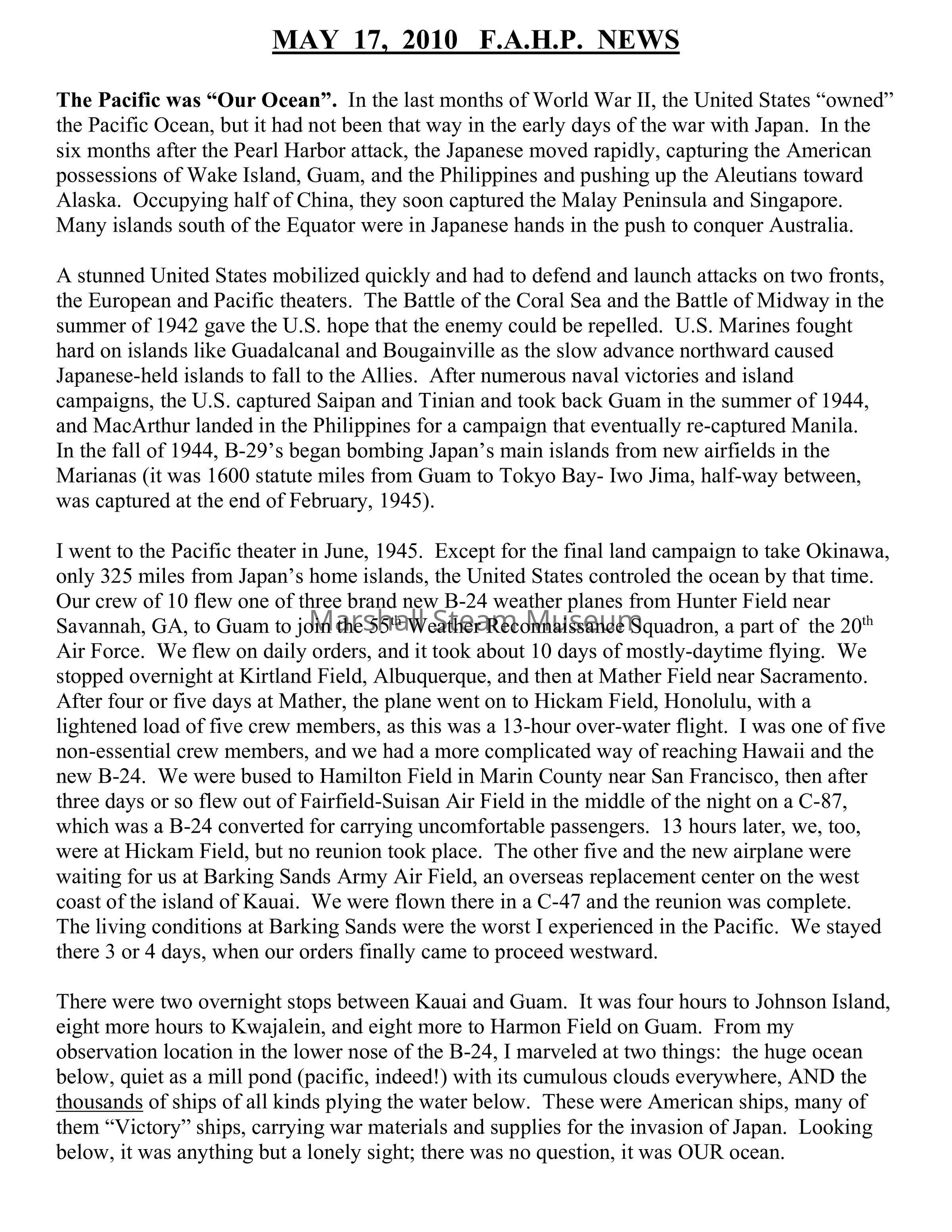 Our crew of 10 flew one of three brand new B-24 weather planes from Hunter Field near Savannah, GA, to Guam to join the 55th Weather Reconnaissance Squadron, a part of the 20th Air Force. We flew on daily orders, and it took about 10 days of mostly-daytime flying. We stopped overnight at Kirtland Field, Albuquerque, and then at Mather Field near Sacramento. After four or five days at Mather, the plane went on to Hickam Field, Honolulu, with a lightened load of five crew members, as this was a 13-hour over-water flight. I was one of five non-essential crew members, and we had a more complicated way of reaching Hawaii and the new B-24. We were bused to Hamilton Field in Marin County near San Francisco, then after three days or so flew out of Fairfield-Suisan Air Field in the middle of the night on a C-87, which was a B-24 converted for carrying uncomfortable passengers. 13 hours later, we, too, were at Hickam Field, but no reunion took place. The other five and the new airplane were waiting for us at Barking Sands Army Air Field, an overseas replacement center on the west coast of the island of Kauai. We were flown there in a C-47 and the reunion was complete. The living conditions at Barking Sands were the worst I experienced in the Pacific. We stayed there 3 or 4 days, when our orders finally came to proceed westward.