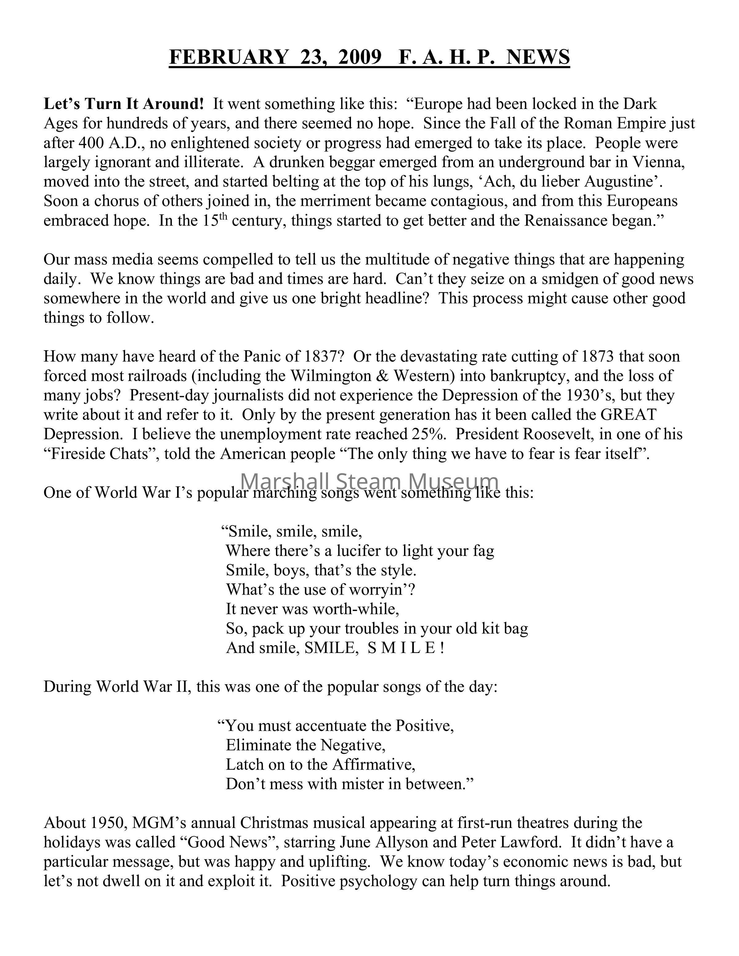 How many have heard of the Panic of 1837? Or the devastating rate cutting of 1873 that soon forced most railroads (including the Wilmington & Western) into bankruptcy, and the loss of many jobs? Present-day journalists did not experience the Depression of the 1930’s, but they write about it and refer to it. Only by the present generation has it been called the GREAT Depression. I believe the unemployment rate reached 25%. President Roosevelt, in one of his “Fireside Chats”, told the American people “The only thing we have to fear is fear itself”.