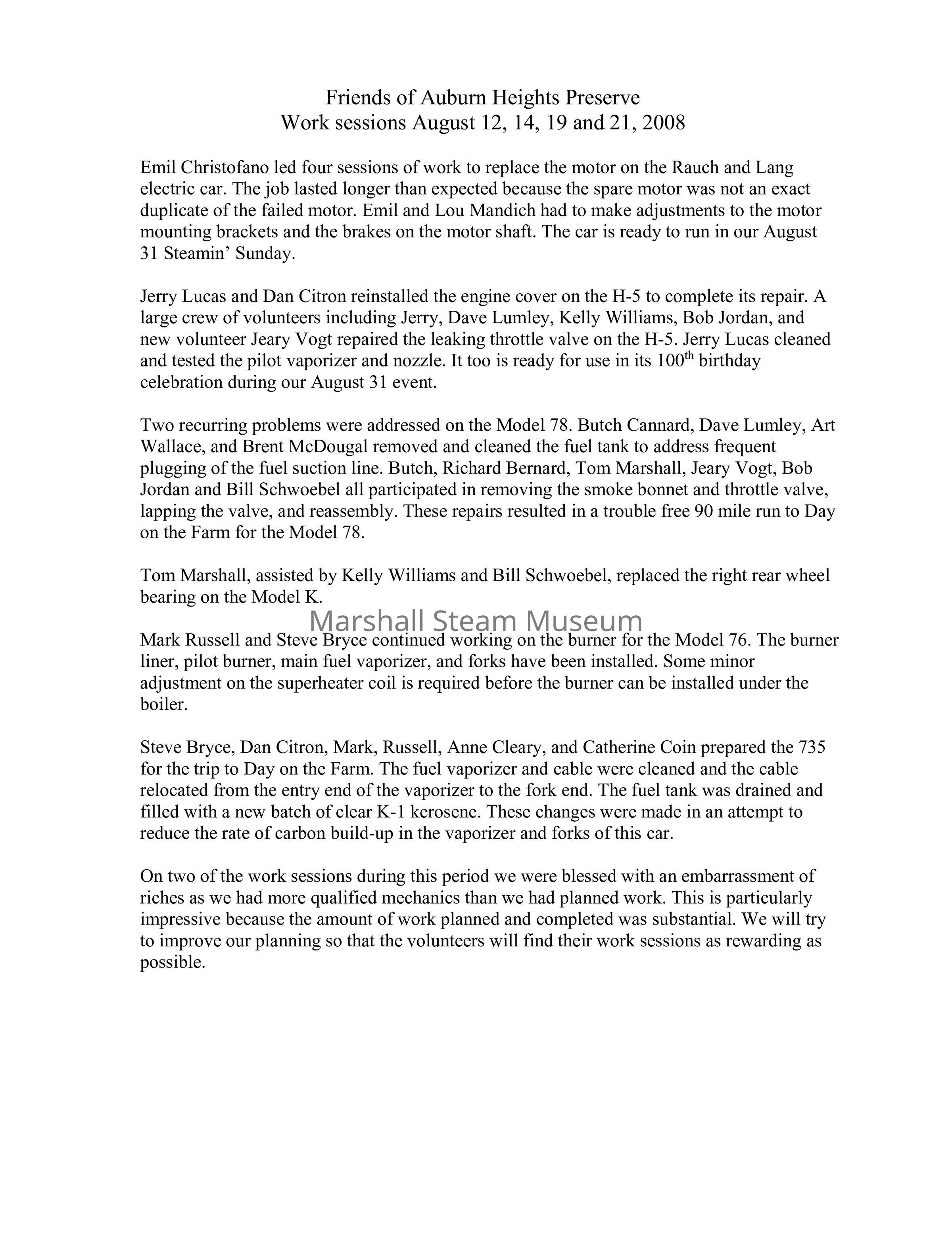 Emil Christofano led four sessions of work to replace the motor on the Rauch and Lang electric car. The job lasted longer than expected because the spare motor was not an exact duplicate of the failed motor. Emil and Lou Mandich had to make adjustments to the motor mounting brackets and the brakes on the motor shaft. The car is ready to run in our August 31 Steamin’ Sunday.