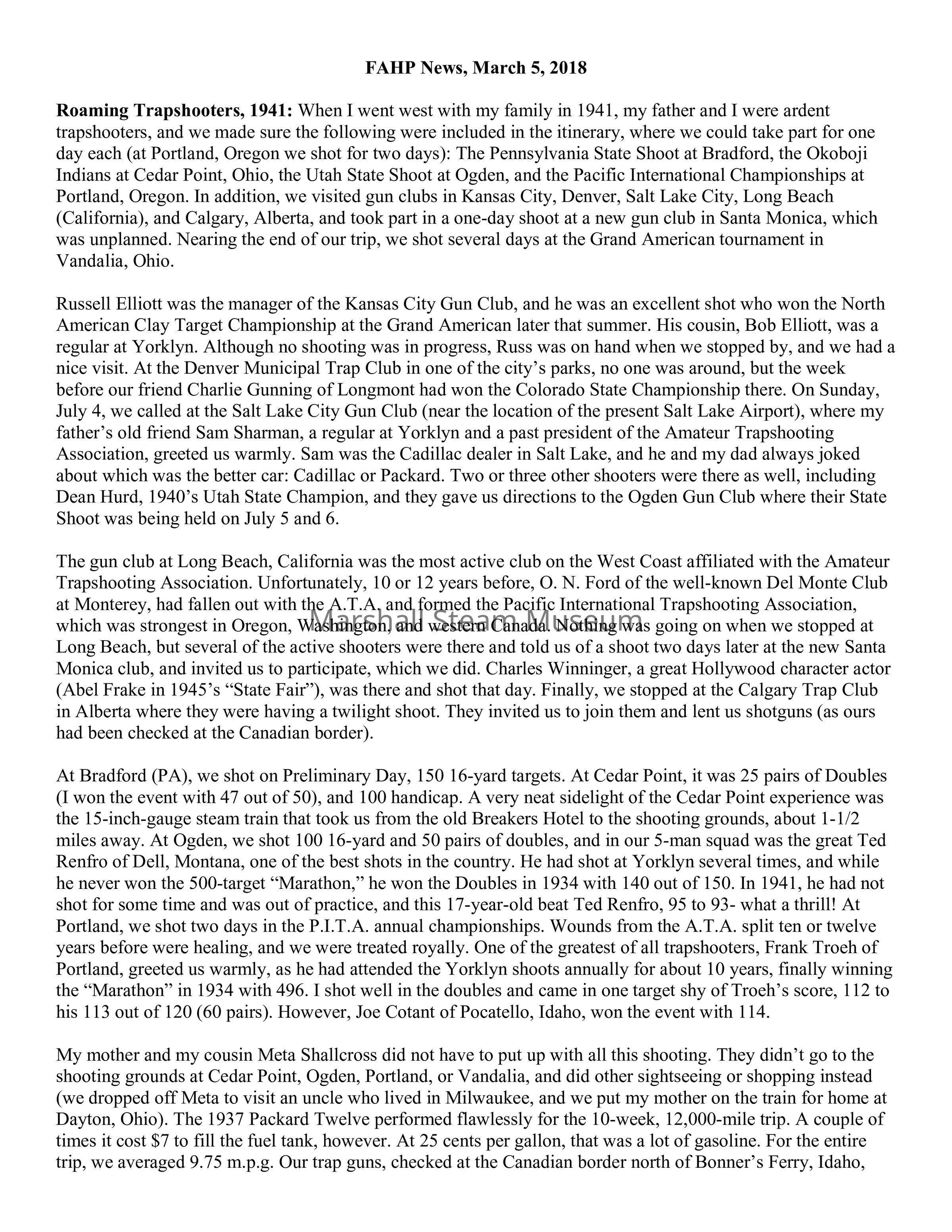 Roaming Trapshooters, 1941: When I went west with my family in 1941, my father and I were ardent trapshooters, and we made sure the following were included in the itinerary, where we could take part for one day each (at Portland, Oregon we shot for two days): The Pennsylvania State Shoot at Bradford, the Okoboji Indians at Cedar Point, Ohio, the Utah State Shoot at Ogden, and the Pacific International Championships at Portland, Oregon. In addition, we visited gun clubs in Kansas City, Denver, Salt Lake City, Long Beach (California), and Calgary, Alberta, and took part in a one-day shoot at a new gun club in Santa Monica, which was unplanned. Nearing the end of our trip, we shot several days at the Grand American tournament in Vandalia, Ohio.