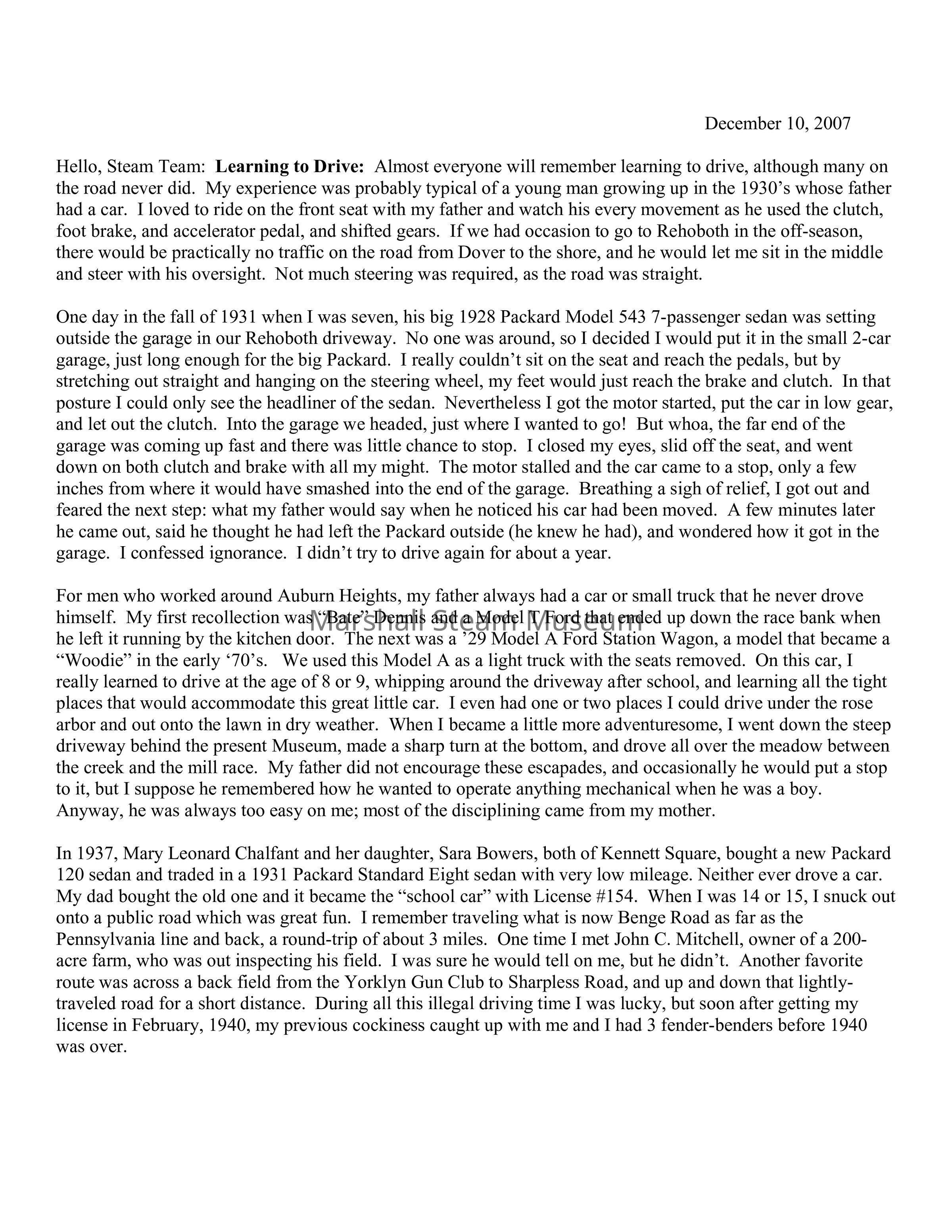 One day in the fall of 1931 when I was seven, his big 1928 Packard Model 543 7-passenger sedan was setting outside the garage in our Rehoboth driveway. No one was around, so I decided I would put it in the small 2-car garage, just long enough for the big Packard. I really couldn’t sit on the seat and reach the pedals, but by stretching out straight and hanging on the steering wheel, my feet would just reach the brake and clutch. In that posture I could only see the headliner of the sedan. Nevertheless I got the motor started, put the car in low gear, and let out the clutch. Into the garage we headed, just where I wanted to go! But whoa, the far end of the garage was coming up fast and there was little chance to stop. I closed my eyes, slid off the seat, and went down on both clutch and brake with all my might. The motor stalled and the car came to a stop, only a few inches from where it would have smashed into the end of the garage. Breathing a sigh of relief, I got out and feared the next step: what my father would say when he noticed his car had been moved. A few minutes later he came out, said he thought he had left the Packard outside (he knew he had), and wondered how it got in the garage. I confessed ignorance. I didn’t try to drive again for about a year.