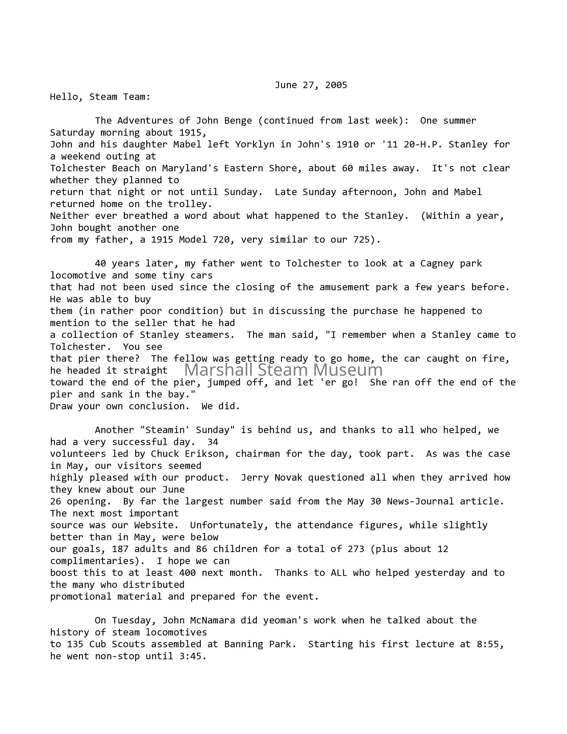 Another "Steamin' Sunday" is behind us, and thanks to all who helped, we had a very successful day. 34 volunteers led by Chuck Erikson, chairman for the day, took part. As was the case in May, our visitors seemed highly pleased with our product. Jerry Novak questioned all when they arrived how they knew about our June 26 opening. By far the largest number said from the May 30 News-Journal article. The next most important source was our Website. Unfortunately, the attendance figures, while slightly better than in May, were below our goals, 187 adults and 86 children for a total of 273 (plus about 12 complimentaries). I hope we can boost this to at least 400 next month. Thanks to ALL who helped yesterday and to the many who distributed promotional material and prepared for the event.