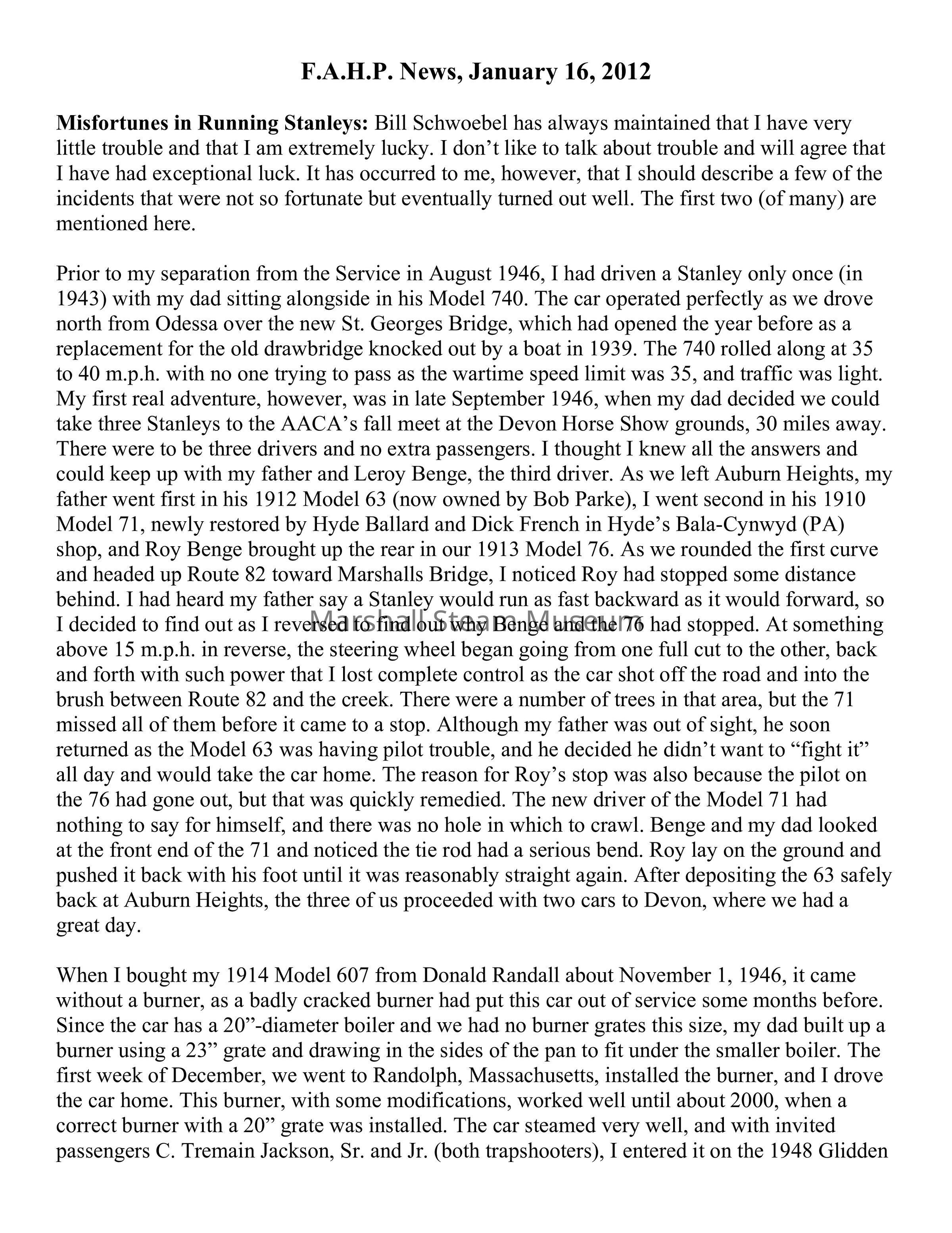 Misfortunes in Running Stanleys: Bill Schwoebel has always maintained that I have very little trouble and that I am extremely lucky. I don’t like to talk about trouble and will agree that I have had exceptional luck. It has occurred to me, however, that I should describe a few of the incidents that were not so fortunate but eventually turned out well. The first two (of many) are mentioned here.