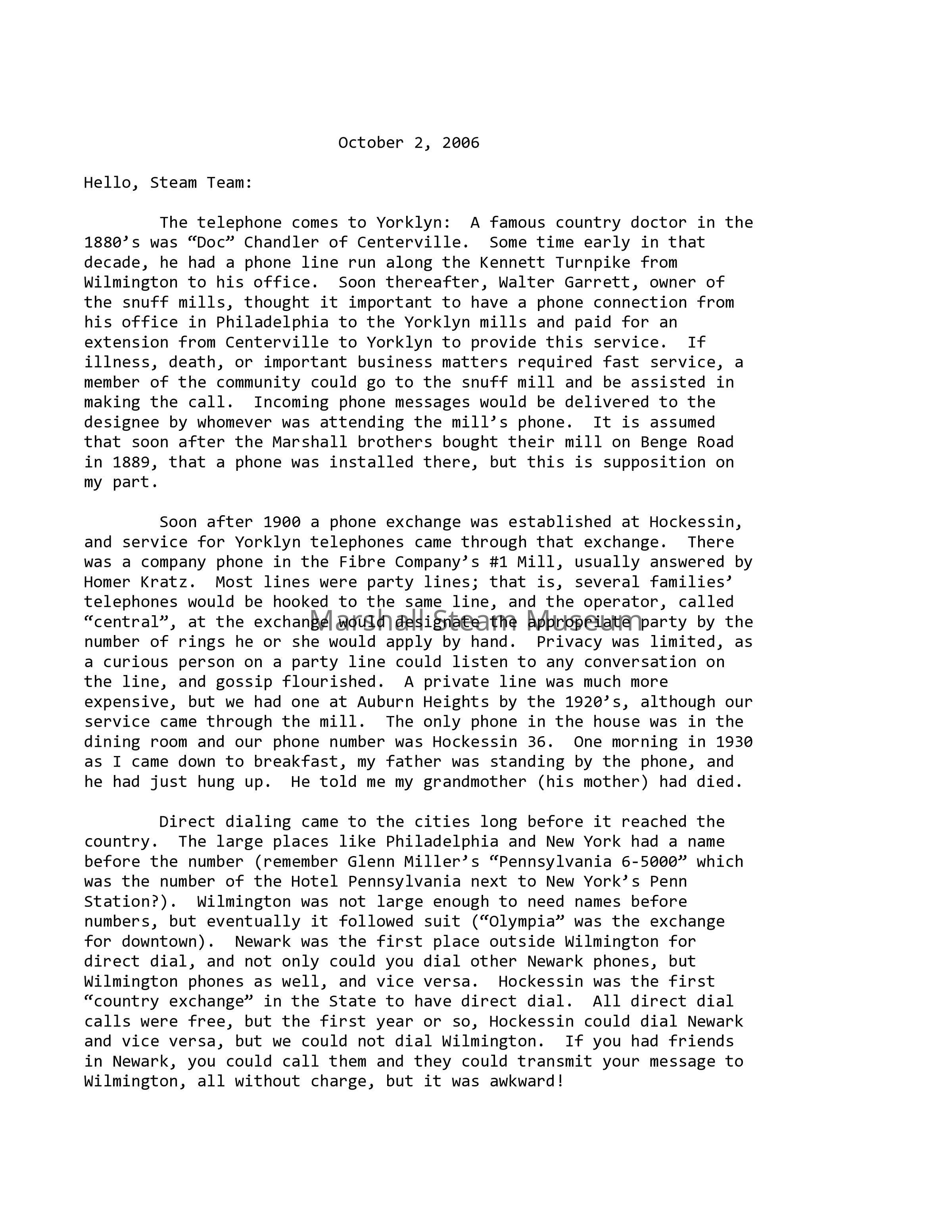 The telephone comes to Yorklyn: A famous country doctor in the 1880’s was “Doc” Chandler of Centerville. Some time early in that decade, he had a phone line run along the Kennett Turnpike from Wilmington to his office. Soon thereafter, Walter Garrett, owner of the snuff mills, thought it important to have a phone connection from his office in Philadelphia to the Yorklyn mills and paid for an extension from Centerville to Yorklyn to provide this service. If illness, death, or important business matters required fast service, a member of the community could go to the snuff mill and be assisted in making the call. Incoming phone messages would be delivered to the designee by whomever was attending the mill’s phone. It is assumed that soon after the Marshall brothers bought their mill on Benge Road in 1889, that a phone was installed there, but this is supposition on my part.