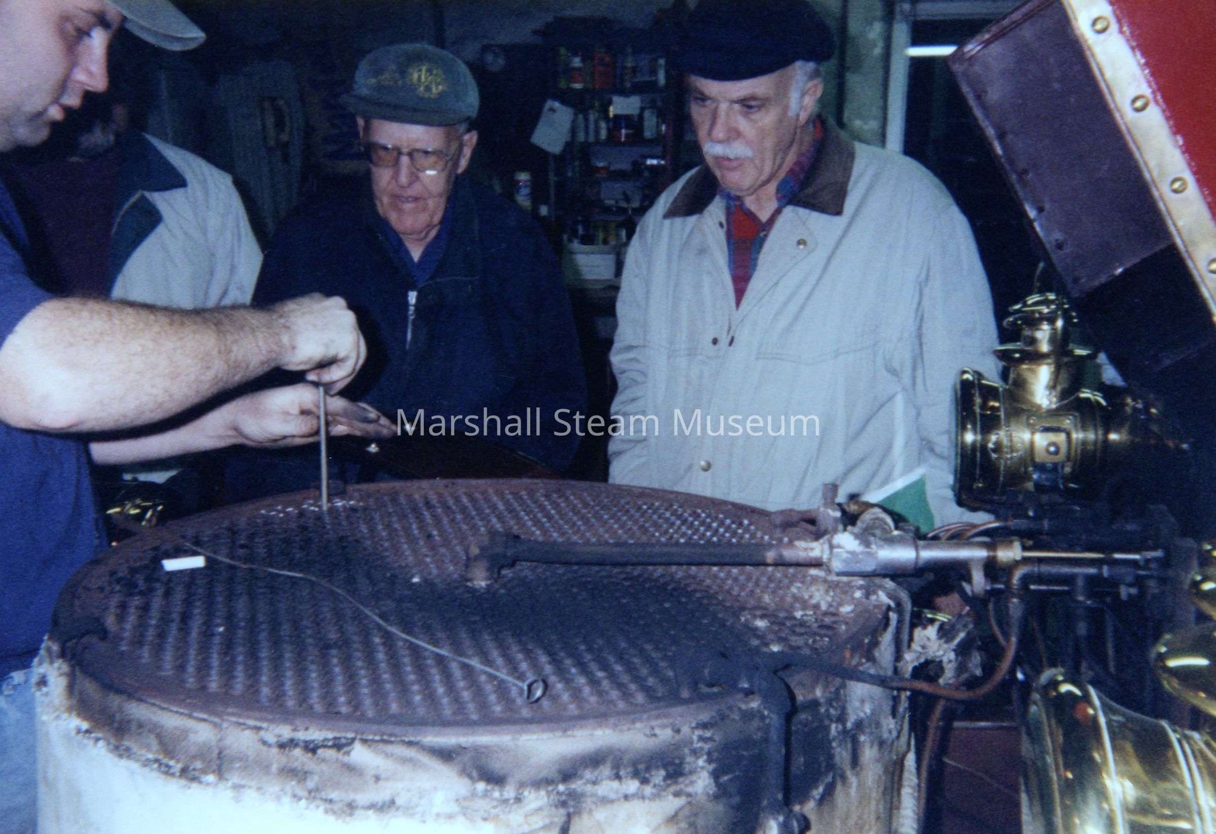 Brian Crozier cleaning boiler tubes while Tom Marshall and Richard Bernard look onPhotograph Details