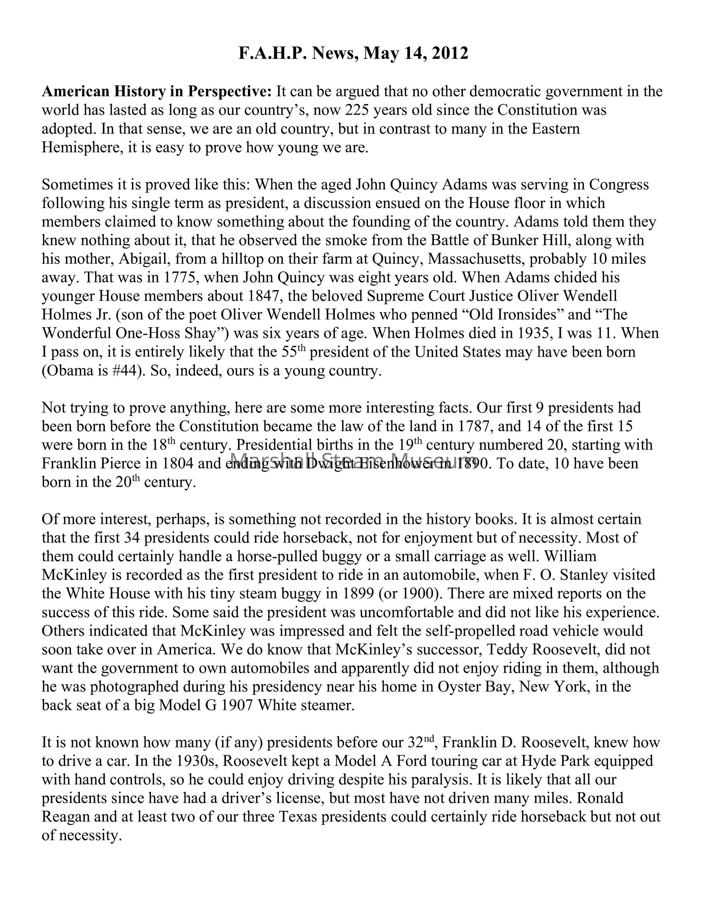 Sometimes it is proved like this: When the aged John Quincy Adams was serving in Congress following his single term as president, a discussion ensued on the House floor in which members claimed to know something about the founding of the country. Adams told them they knew nothing about it, that he observed the smoke from the Battle of Bunker Hill, along with his mother, Abigail, from a hilltop on their farm at Quincy, Massachusetts, probably 10 miles away. That was in 1775, when John Quincy was eight years old. When Adams chided his younger House members about 1847, the beloved Supreme Court Justice Oliver Wendell Holmes Jr. (son of the poet Oliver Wendell Holmes who penned “Old Ironsides” and “The Wonderful One-Hoss Shay”) was six years of age. When Holmes died in 1935, I was 11. When I pass on, it is entirely likely that the 55th president of the United States may have been born (Obama is #44). So, indeed, ours is a young country.