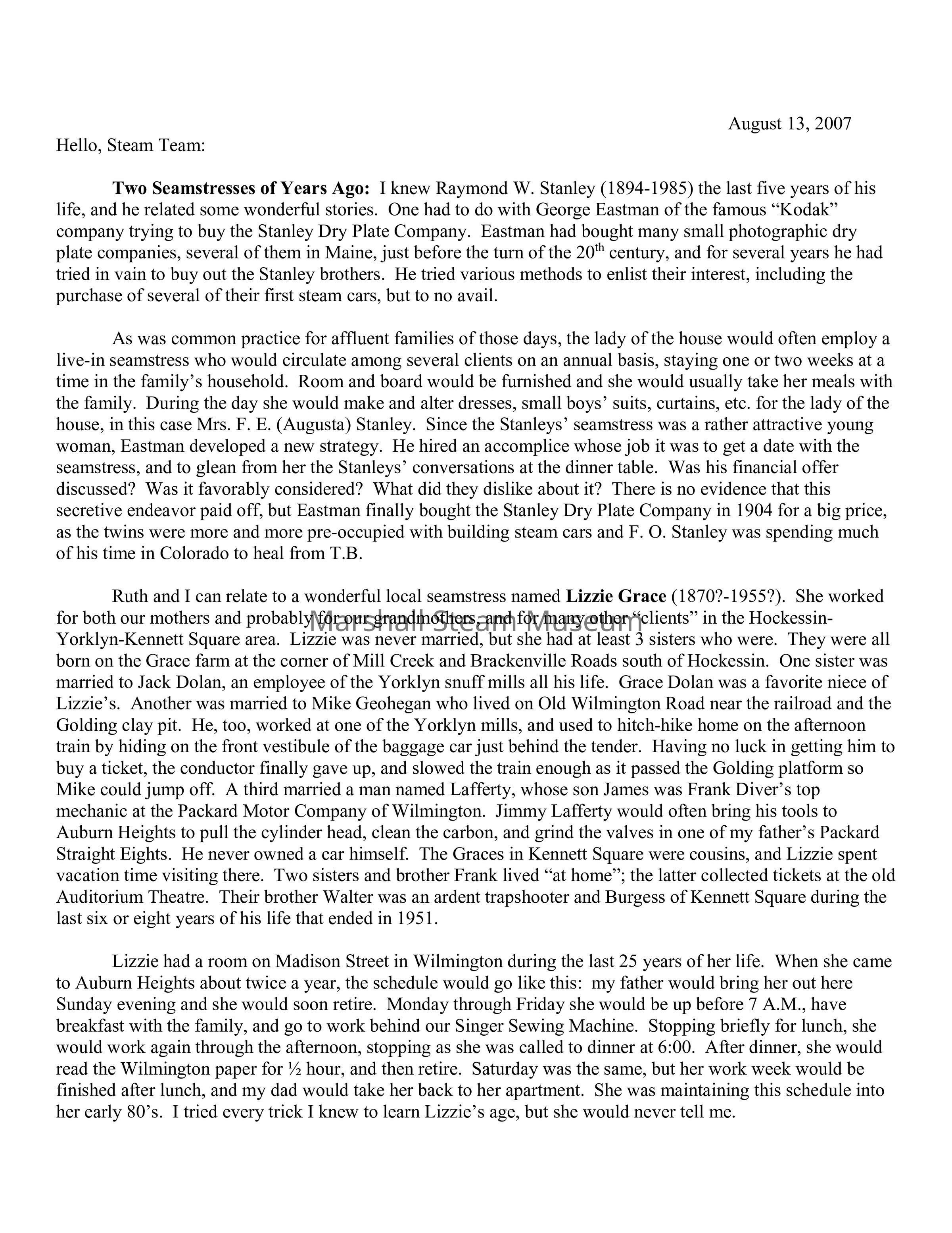 Two Seamstresses of Years Ago: I knew Raymond W. Stanley (1894-1985) the last five years of his life, and he related some wonderful stories. One had to do with George Eastman of the famous “Kodak” company trying to buy the Stanley Dry Plate Company. Eastman had bought many small photographic dry plate companies, several of them in Maine, just before the turn of the 20th century, and for several years he had tried in vain to buy out the Stanley brothers. He tried various methods to enlist their interest, including the purchase of several of their first steam cars, but to no avail.