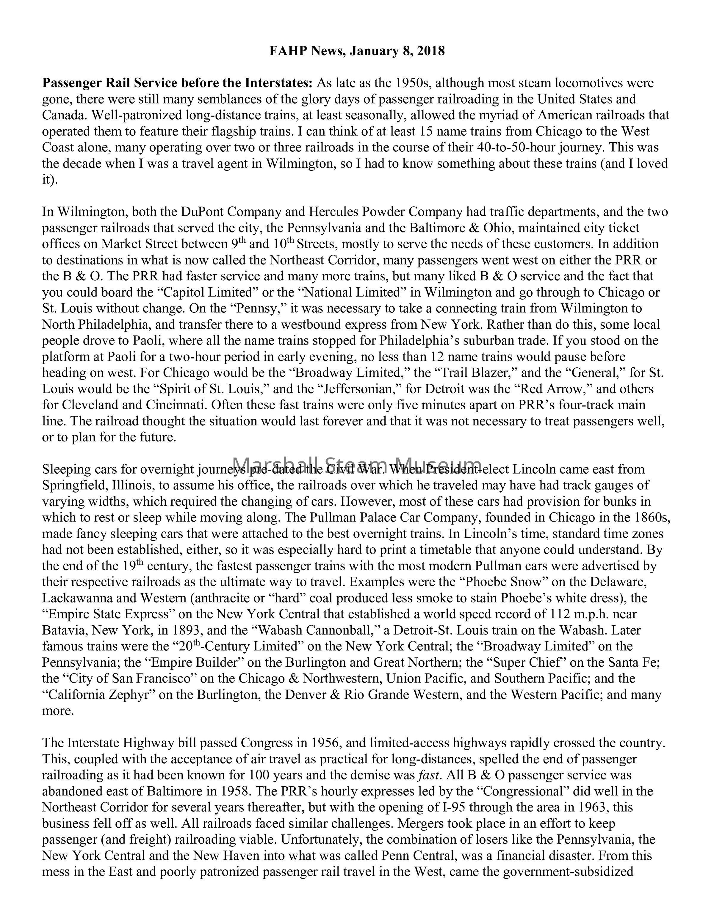 Passenger Rail Service before the Interstates: As late as the 1950s, although most steam locomotives were gone, there were still many semblances of the glory days of passenger railroading in the United States and Canada. Well-patronized long-distance trains, at least seasonally, allowed the myriad of American railroads that operated them to feature their flagship trains. I can think of at least 15 name trains from Chicago to the West Coast alone, many operating over two or three railroads in the course of their 40-to-50-hour journey. This was the decade when I was a travel agent in Wilmington, so I had to know something about these trains (and I loved it).