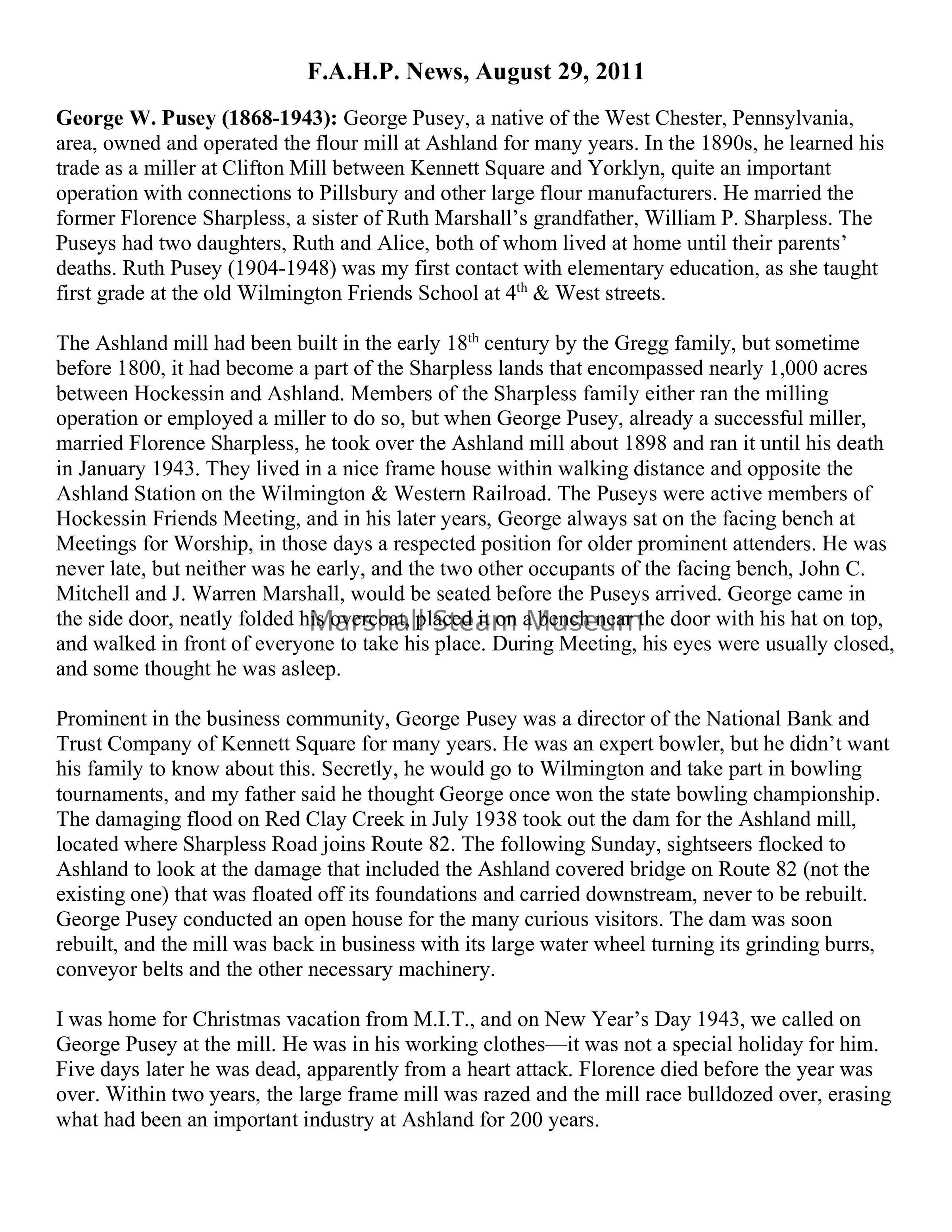 George W. Pusey (1868-1943): George Pusey, a native of the West Chester, Pennsylvania, area, owned and operated the flour mill at Ashland for many years. In the 1890s, he learned his trade as a miller at Clifton Mill between Kennett Square and Yorklyn, quite an important operation with connections to Pillsbury and other large flour manufacturers. He married the former Florence Sharpless, a sister of Ruth Marshall’s grandfather, William P. Sharpless. The Puseys had two daughters, Ruth and Alice, both of whom lived at home until their parents’ deaths. Ruth Pusey (1904-1948) was my first contact with elementary education, as she taught first grade at the old Wilmington Friends School at 4th & West streets.