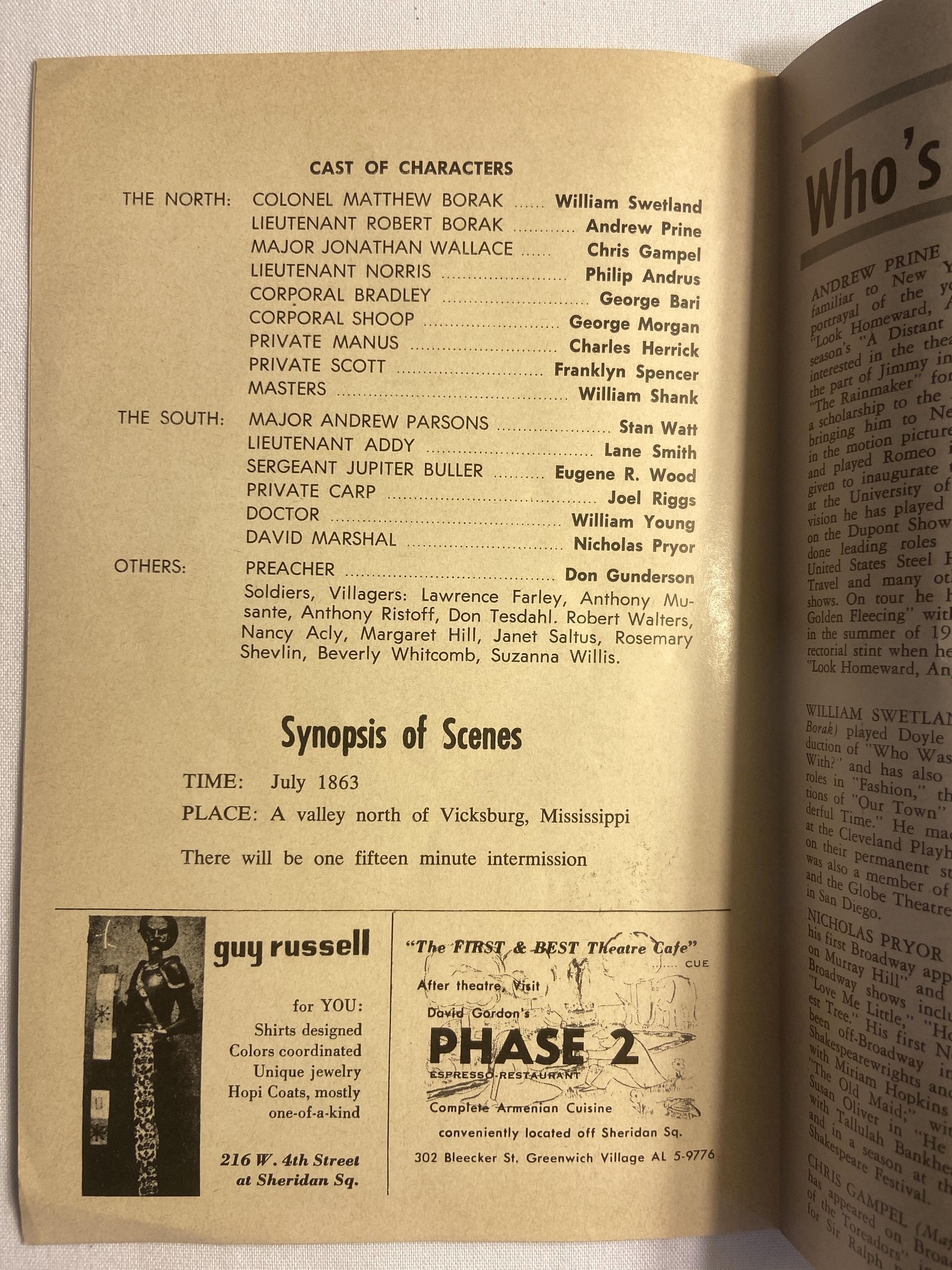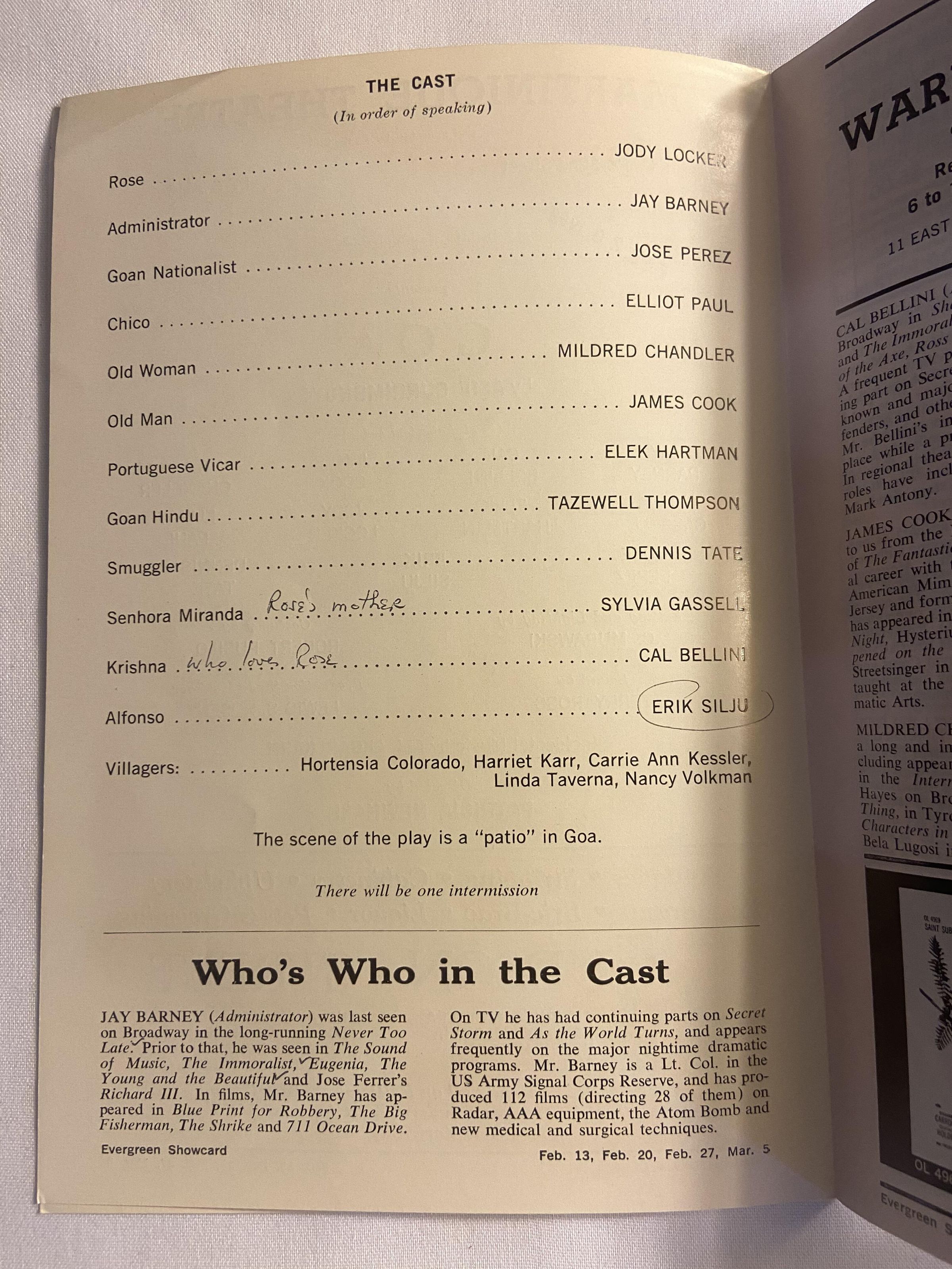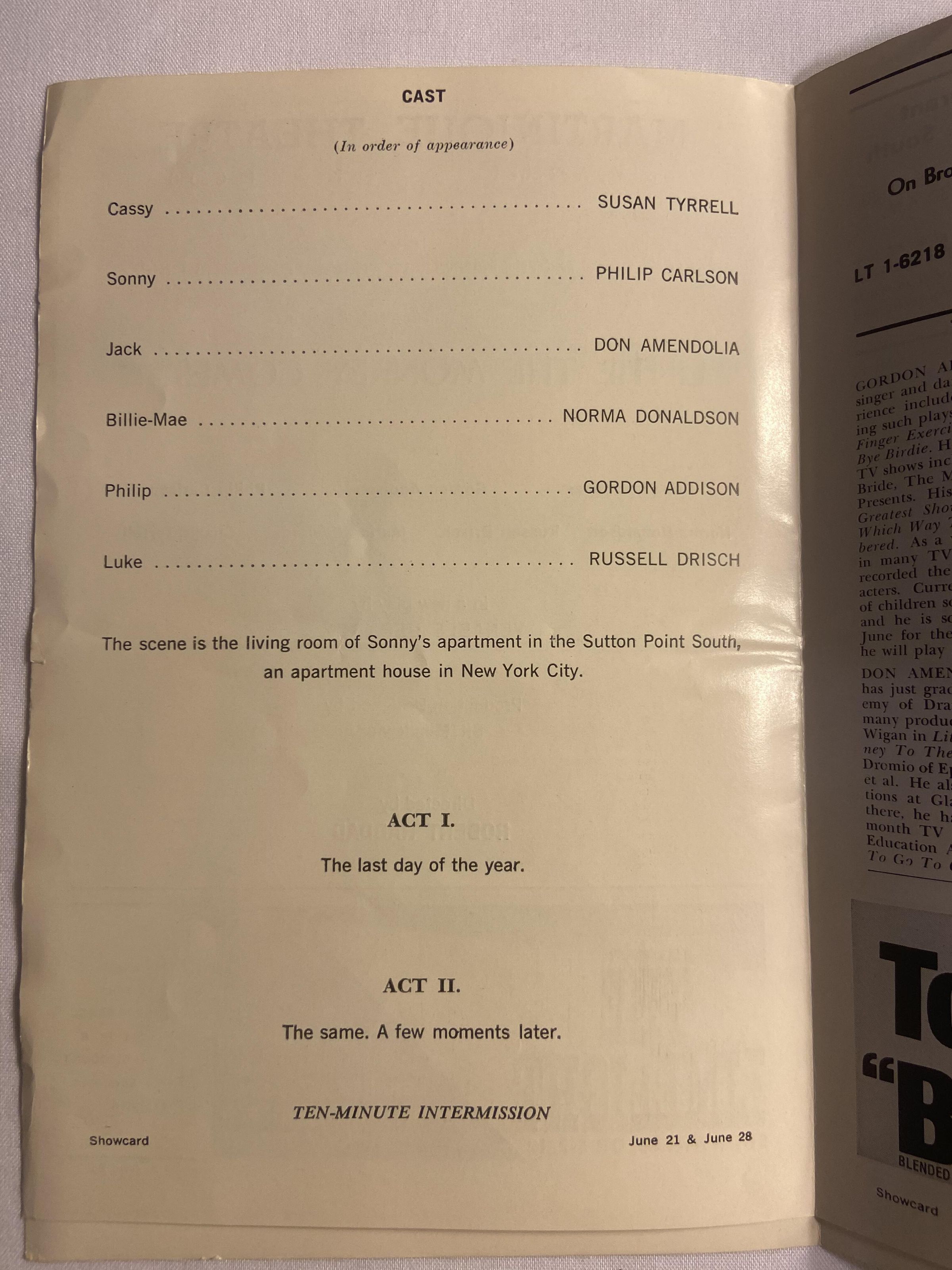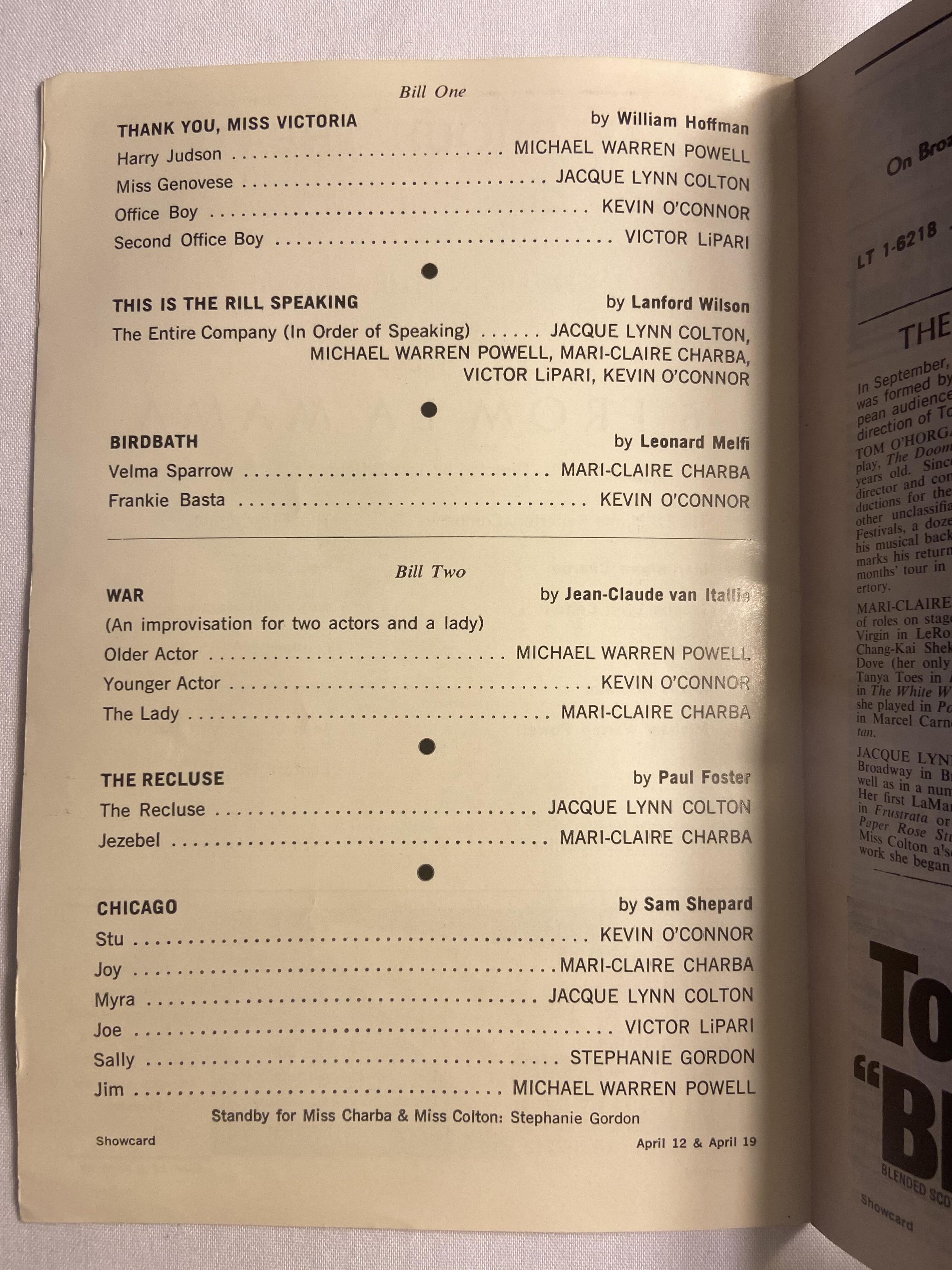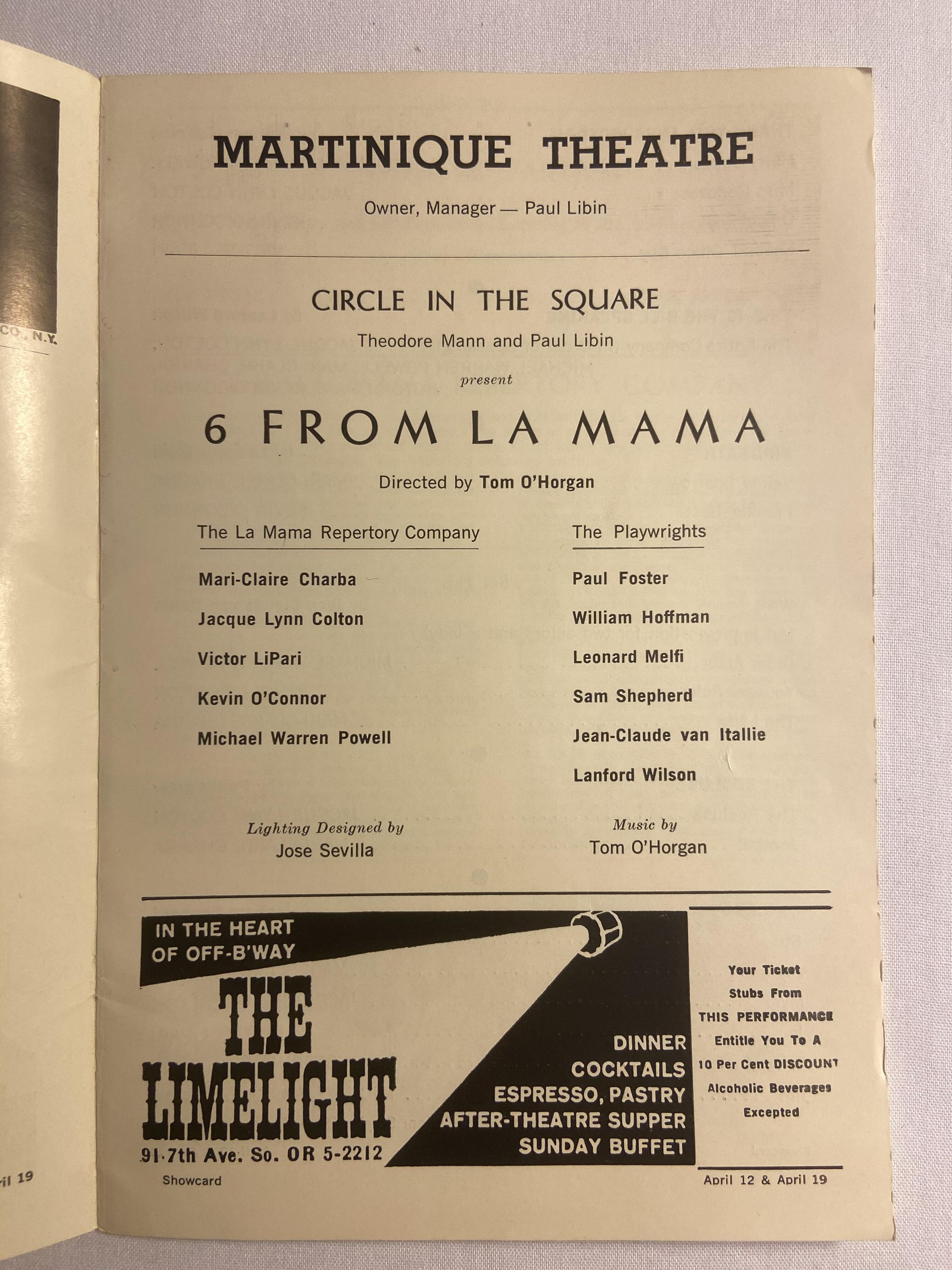 Performance programs include: Borak, U.S.A., Until the Monkey Comes, 6 From La Mama, The Poker Session, and GOA