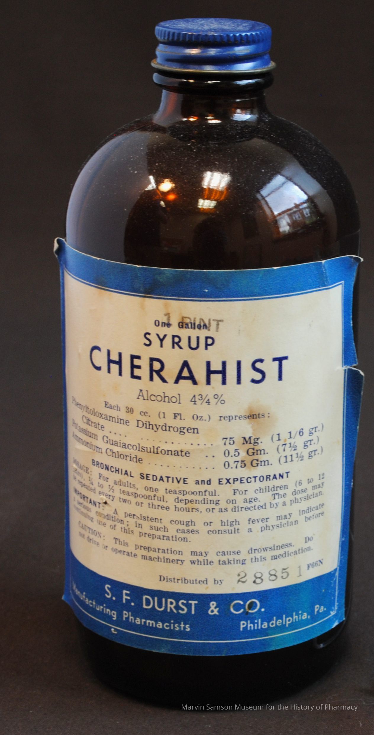 Amber-colored glass bottle containing one pint of "Cherahist" syrup