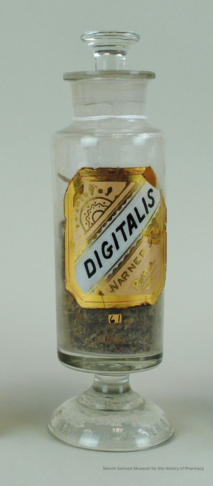 Glass apothecary jar with glass label containing dried digitalis [foxglove]
