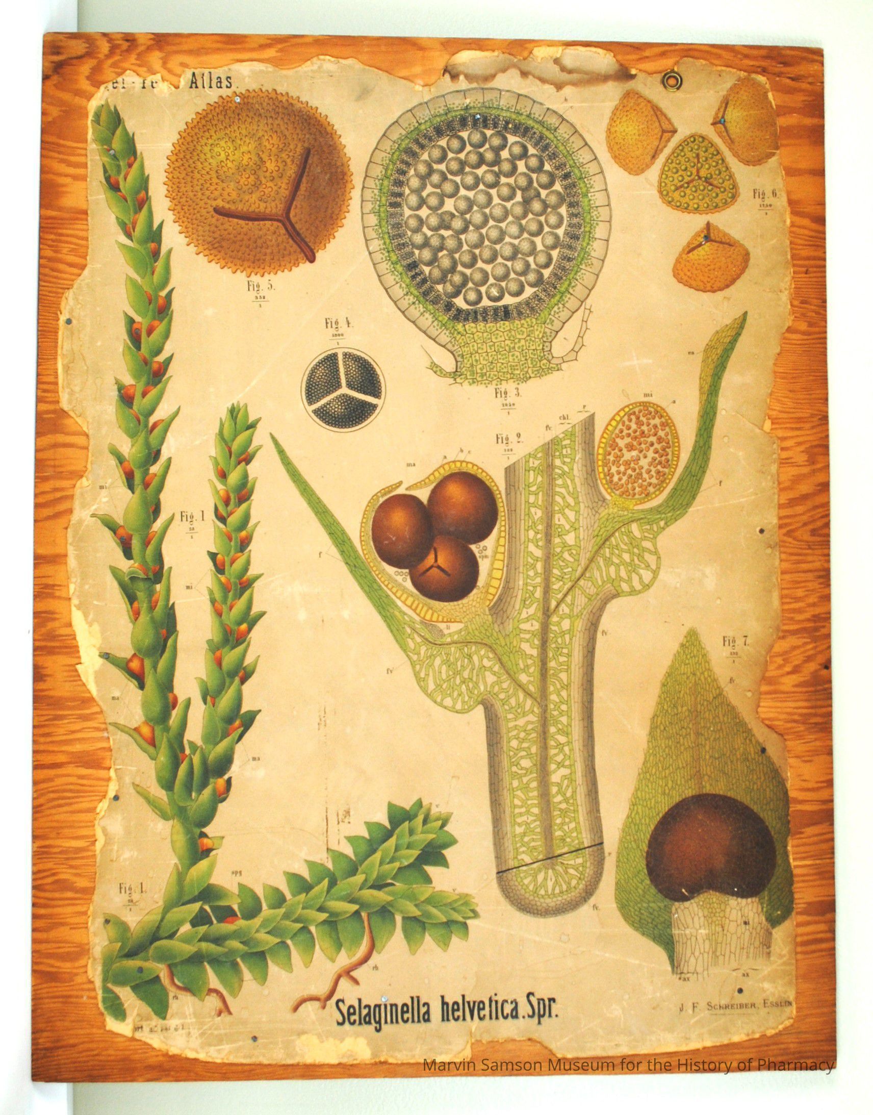 Educational poster with color images of seven life stages of Selaginella Helvetica Spr. Plate from the Dodel Port Botanical Atlas.