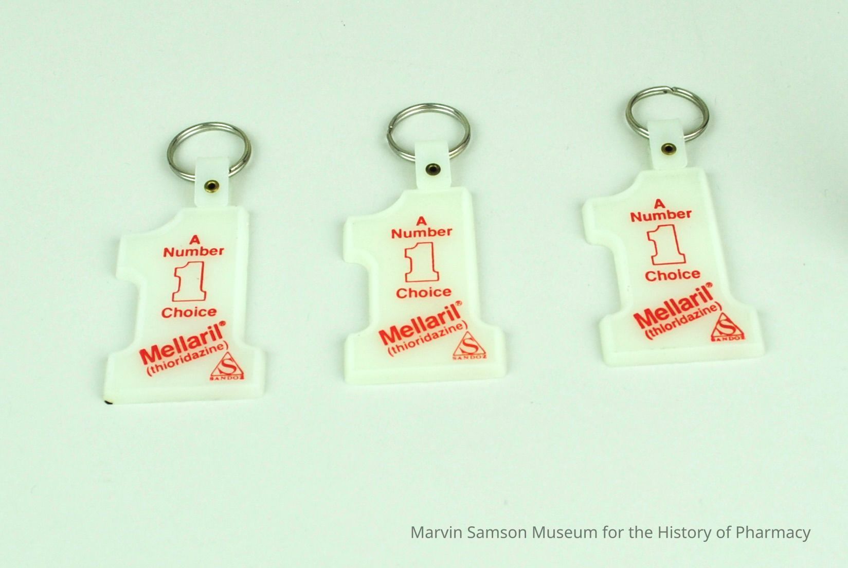 Plastic number 1- shaped keychain with printed text reading: "A Number 1 Choice Mellaril (thioridazine)" in red textMade/Created
