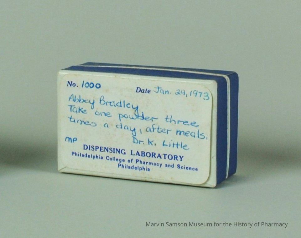 Small blue and white cardboard prescription box for Abbey Bradley, labeled No. 1000 and dated January 29, 1973. Contain small folded white paper packets of powders. Prescribed by Dr. K. Little of the Philadelphia College of Pharmacy and Science Dispensing Laboratory. Written on the label on top of the box in blue ball-point pen are the instructions: "Take one powder three times a day, after meals."Category