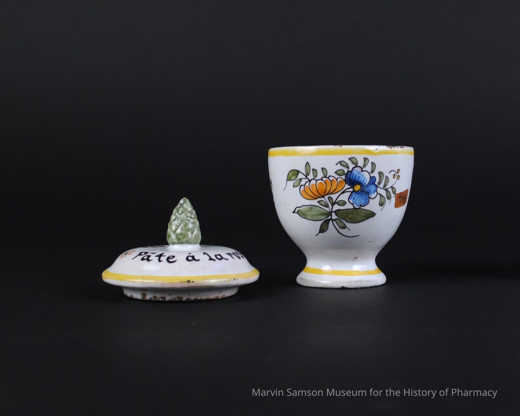 Small ceramic apothecary jar with a narrow foot and a knobbed lid labelled in French, "Pâte á la rose." The front and back of the apothecary jar is decorated with elaborate floral designs. The lid has a yellow stripe and a green pine cone-shaped knob around its circumference. (Part of a set of three: PCP.1940.1.75, PCP.1940.1.76, PCP.1940.1.77)Collection