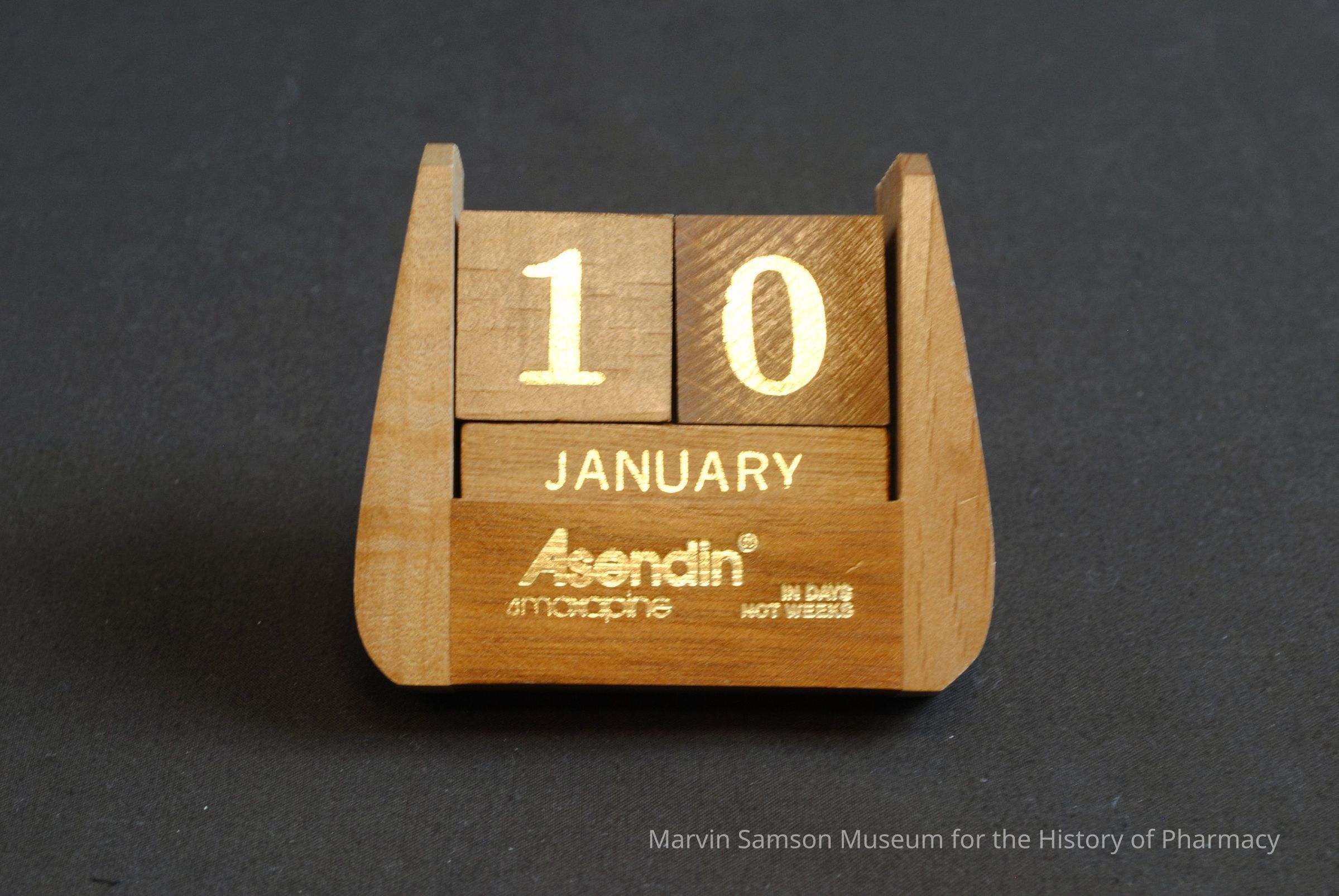 Most of the items in this case are drug advertising pieces distributed to pharmacists and doctors as gifts or 'premiums' in the last decades of the 20th century. The focus of this display is items suitable for the office, specifically for one's desk--such as pen holders, clocks, calendars, and paperweights.Category