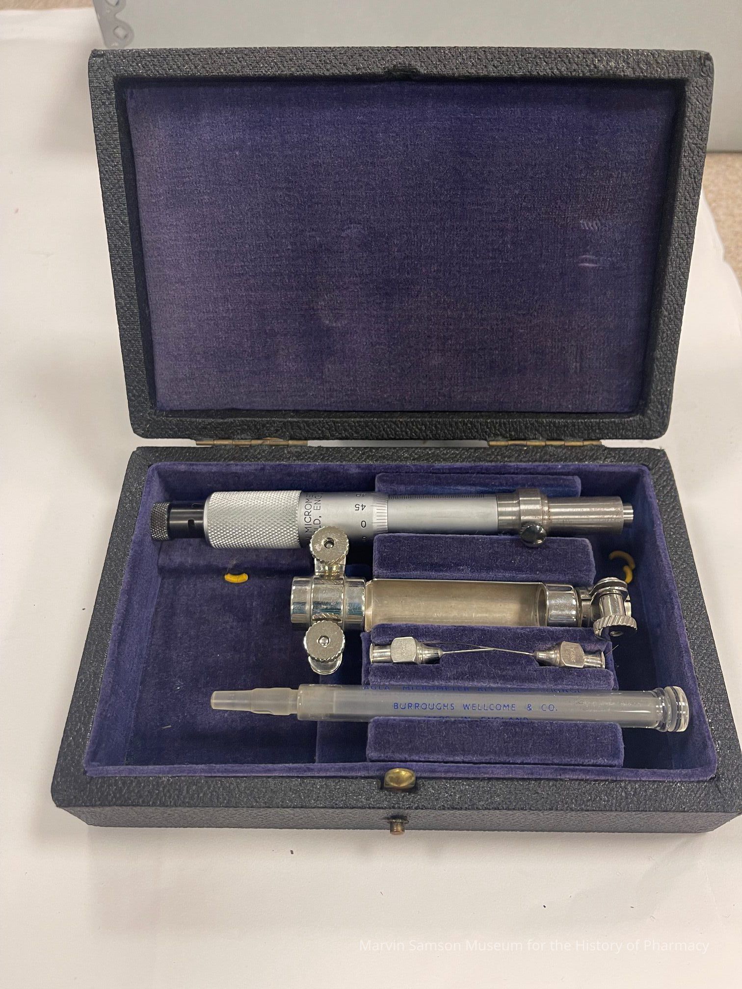 Black box lined with purple velvet holding all-glass syringe, metal micrometer, and needlesMade/Created